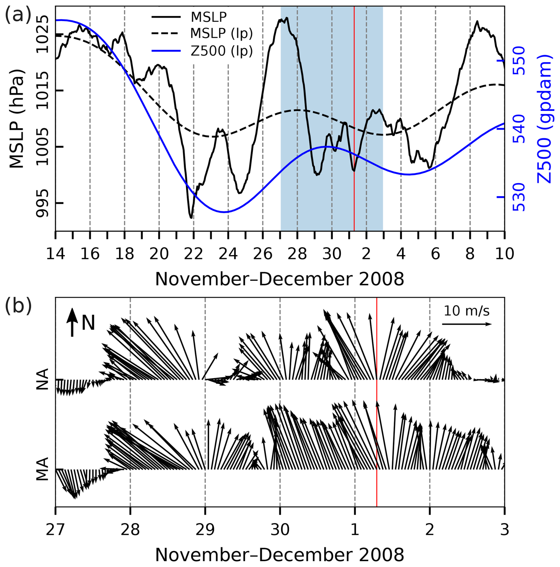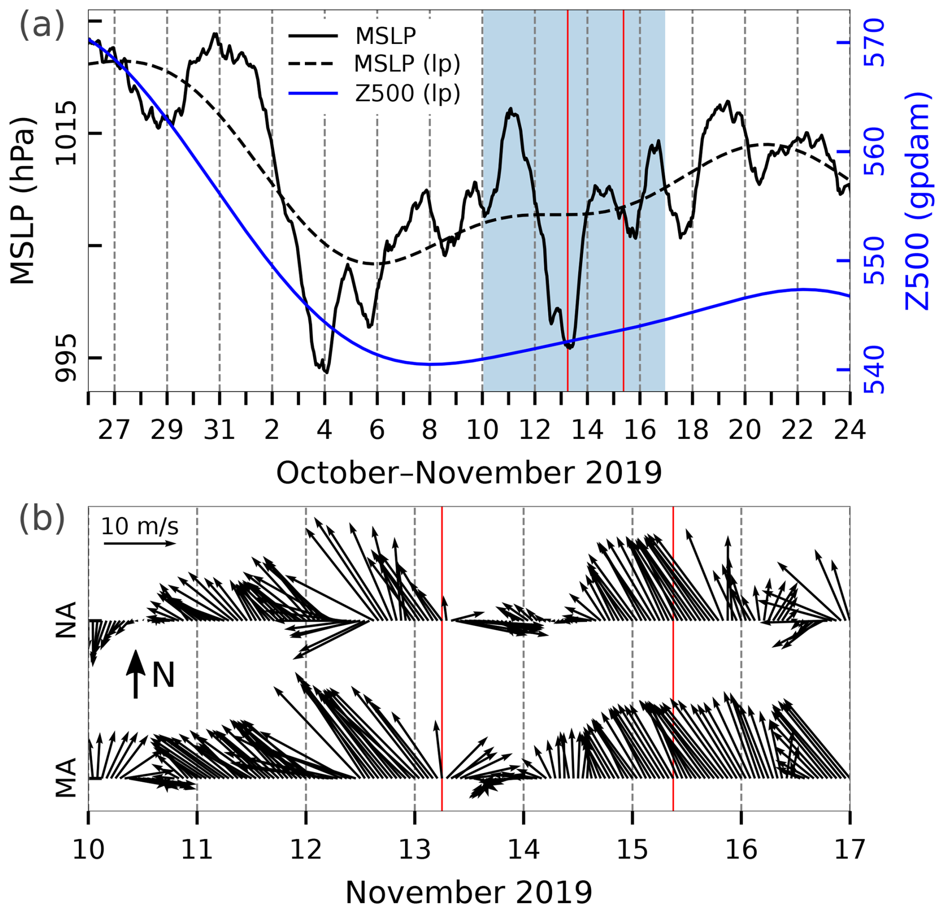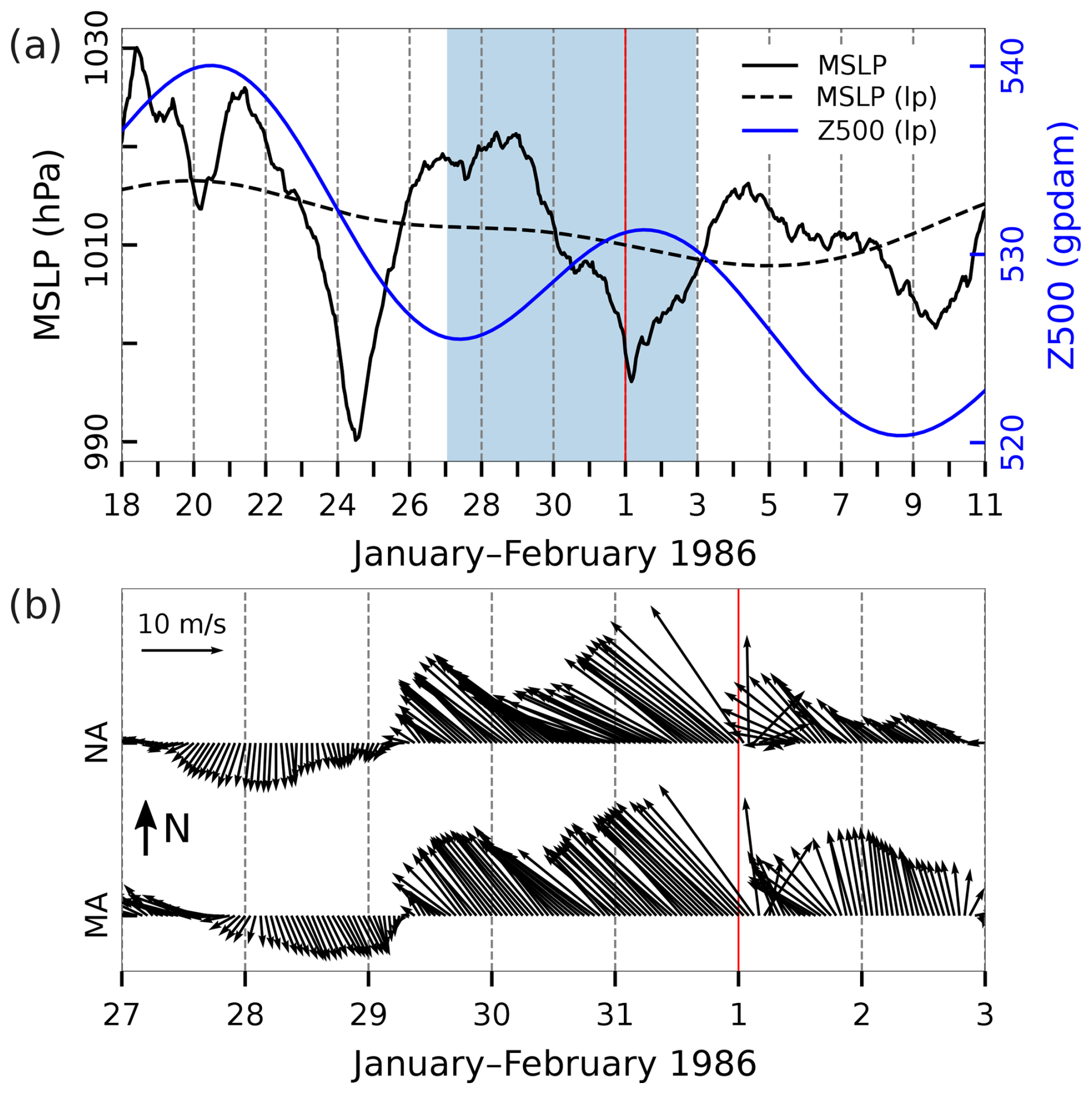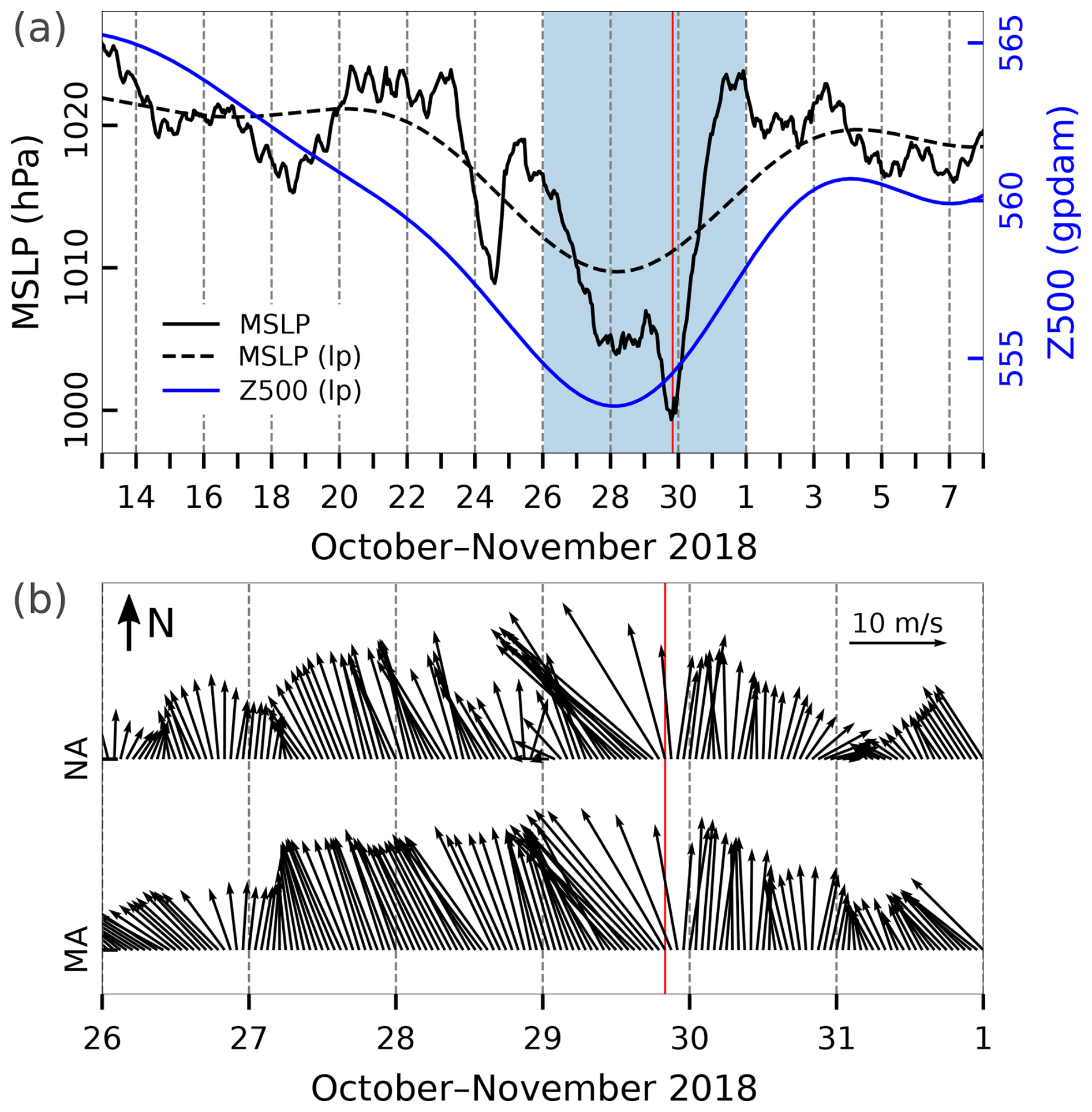 To analyse atmospheric forcing on a planetary scale and the corresponding SL response (planetary-scale component), we compared low-pass series of MSLP, Z500, and W10 (filtered with a 10 d cut-off frequency) with joint planetary-scale and long-term sea-level components. While planetary atmospheric forcing acts over periods of 10 d<T< 100 d and, thus, presumably affects only planetary-scale component (10 d<T< 100 d), we use the low-pass-filtered series (and not the band-pass ones) because, at periods longer than 100 d, both atmospheric and SL series show minimal variations over the time frames presented in the figures (approximately 1 month), i.e. series at periods longer than 100 d effectively act as mean values. We focus on MSLP, Z500, and W10 because, during the colder part of the year (over periods of 10 d<T< 100 d), the atmosphere exhibits quasi-barotropic behaviour. This allows disturbances in the middle troposphere (500 hPa) to be reflected at the surface (MSLP and accompanying W10), making Z500 a reliable indicator of planetary-scale surface meteorological conditions. In this paper, both in the text and figures, these low-pass series are labelled as MSLP  (lp), Z500  (lp), and (for sea level) plan + long.
