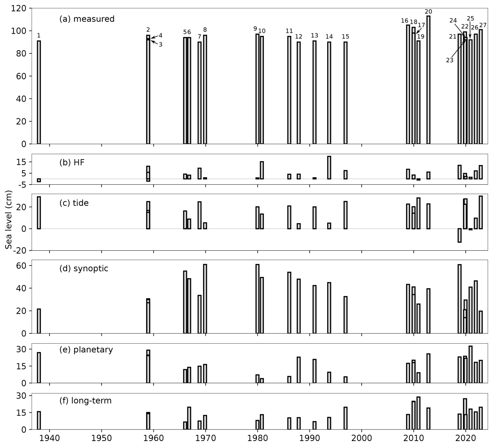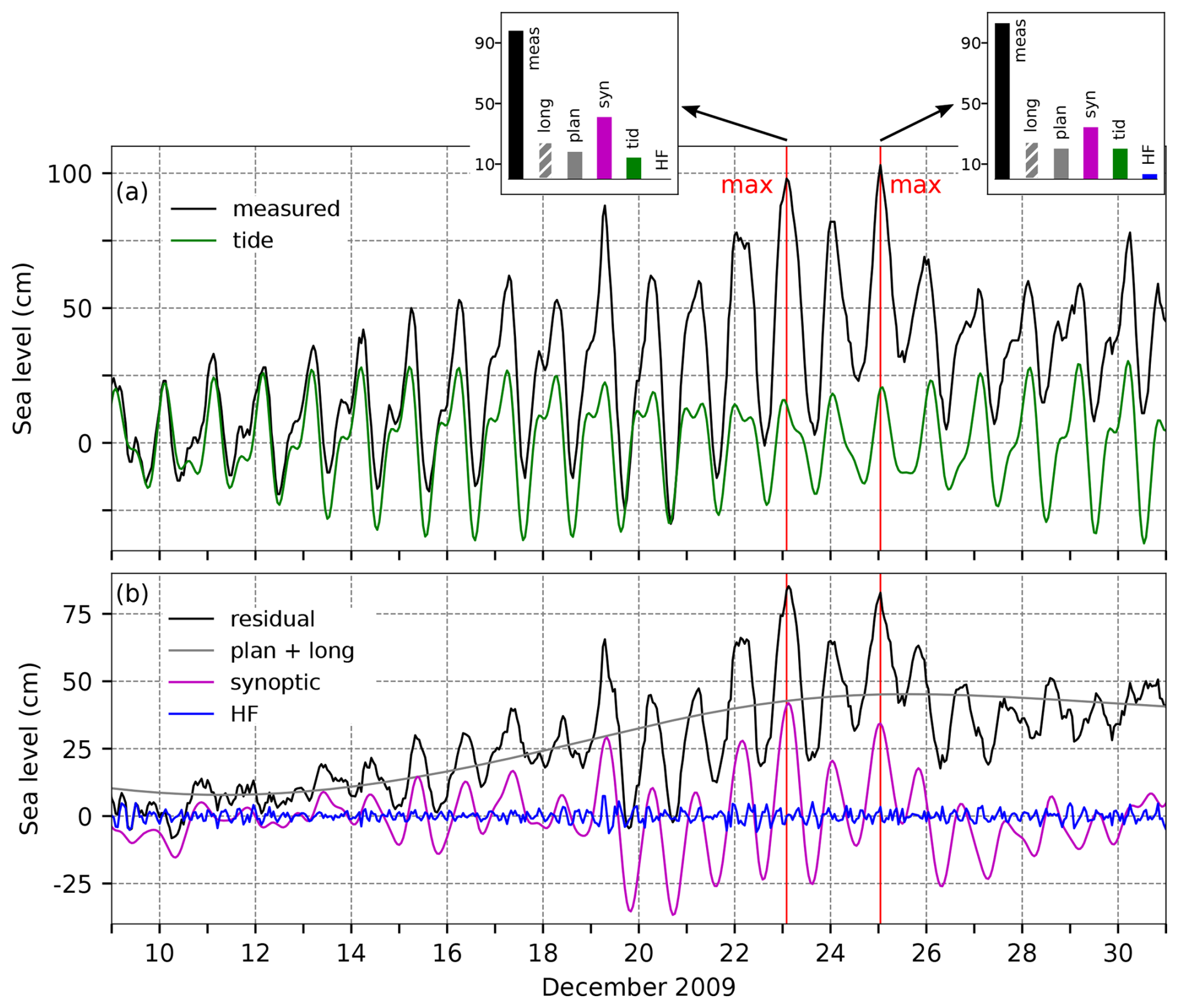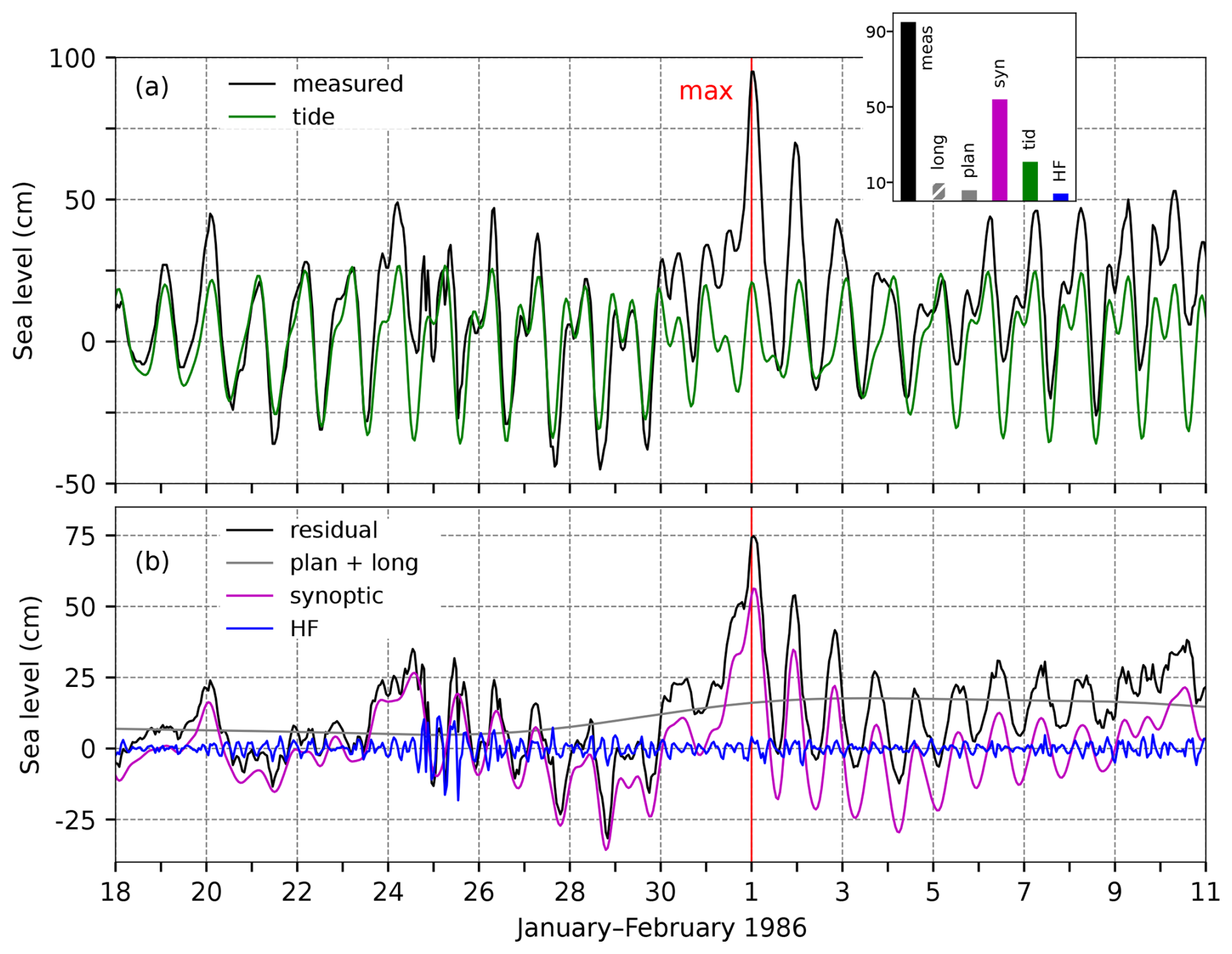 Figures 372 show the five sea-level processes, their contributions to the maxima, and the associated meteorological conditions on synoptic and planetary scales for each episode. Figure 73 presents long-term sea-level variability, decomposed into the three aforementioned sub-processes.
