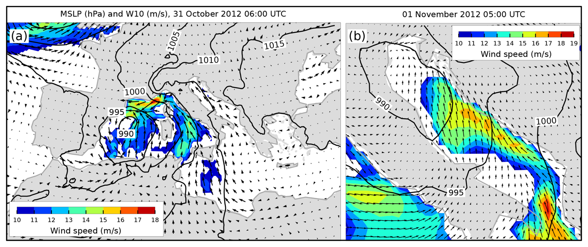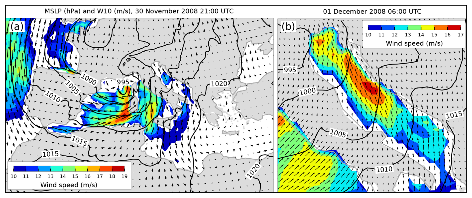Figure 4MSLP (black lines) and W10 (arrows and colours) fields from the NOAA–CIRES–DOE reanalysis. Condition (a) over the Mediterranean that preceded the situation (b) over the Adriatic (an hour before maximum SL in Bakar). Only wind speeds exceeding 10 m s−1 are coloured.