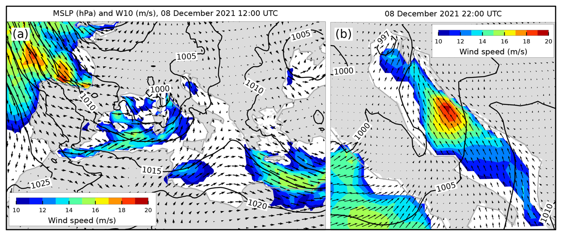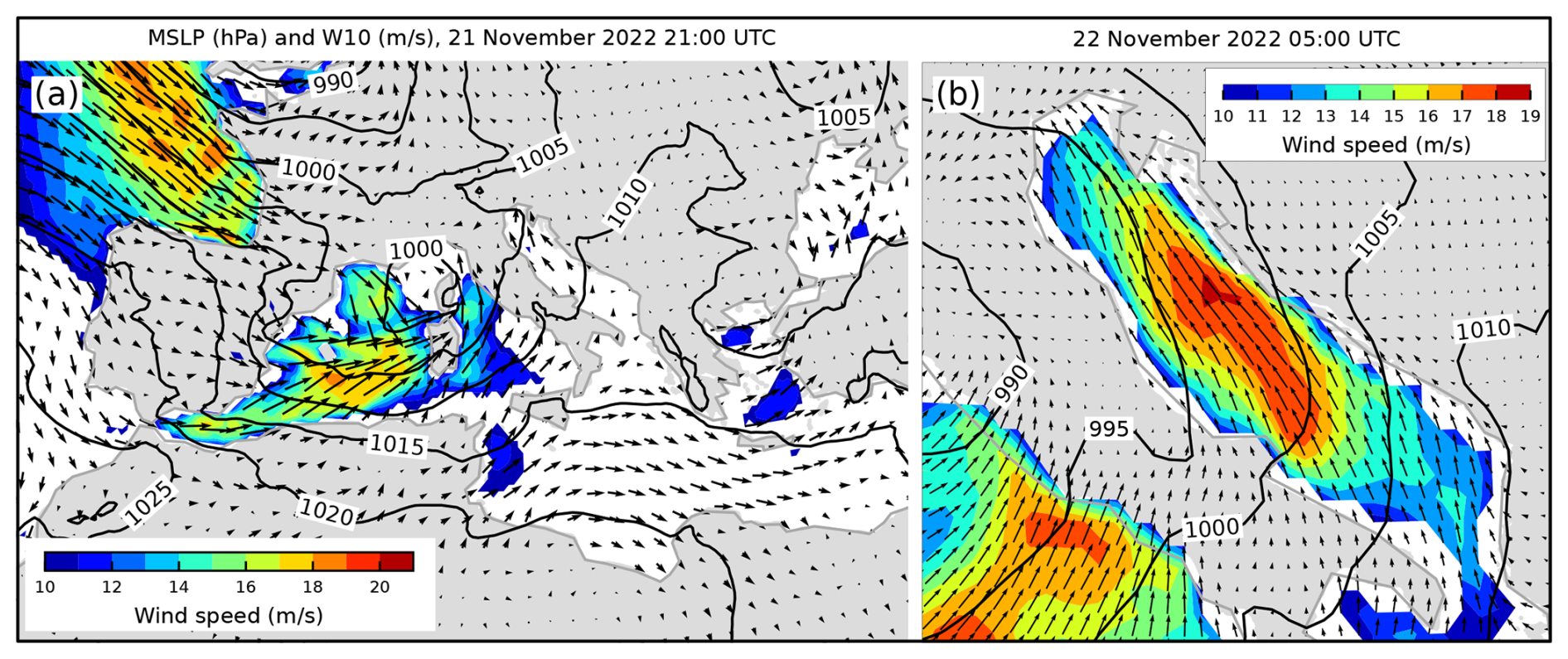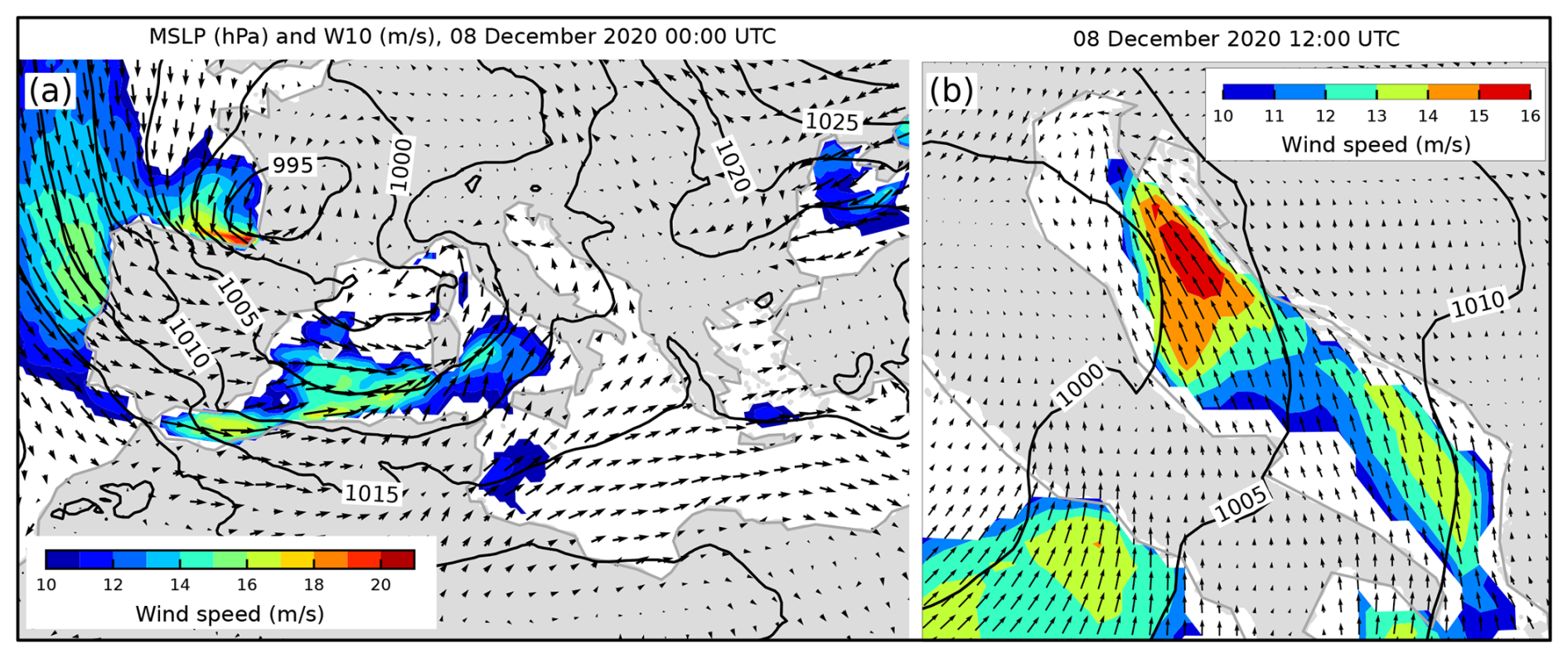 In the days leading up to this episode, weather conditions over the Adriatic were characterised by an air pressure of around 1010 hPa and predominantly southerly winds (Fig. 3). In the upper levels, a southwesterly flow prevailed at the leading edge of a vast trough extending from the Atlantic across western and central Europe to southeastern Europe. Within this trough, as colder air descended from the north towards the British Isles, a surface-based cyclone intensified over Great Britain on 13 and 14 December, with the central air pressure dropping to 985 hPa. At the same time, an upper-level ridge was present over the eastern Mediterranean, accompanied by a surface air pressure of around 1020 hPa. During the night of 14–15 December (Fig. 4a), a new cyclone developed in the Gulf of Lion, quickly moving towards the Tyrrhenian Sea and entering the Adriatic Sea in the early hours of 15 December (Fig. 4b). This situation led to a pronounced MSLP gradient over the Adriatic; as a result, a strong southerly wind developed on 14 December, shifting to strong to gale southwesterly and westerly winds in the evening and during the night of 15–16 December (Fig. 3b) (according to the Beaufort scale, strong wind: 10.8–13.8 m s−1; gale wind: 17.2–20.70 m s−1). Precipitation along the coast was heavier in the northern Adriatic compared to the south: on 15 December, 37 mm was recorded in Rijeka (Trsat); 11 mm was recorded in Novalja (an island near Zadar); and 6 mm was recorded in Hvar (an island near Split).