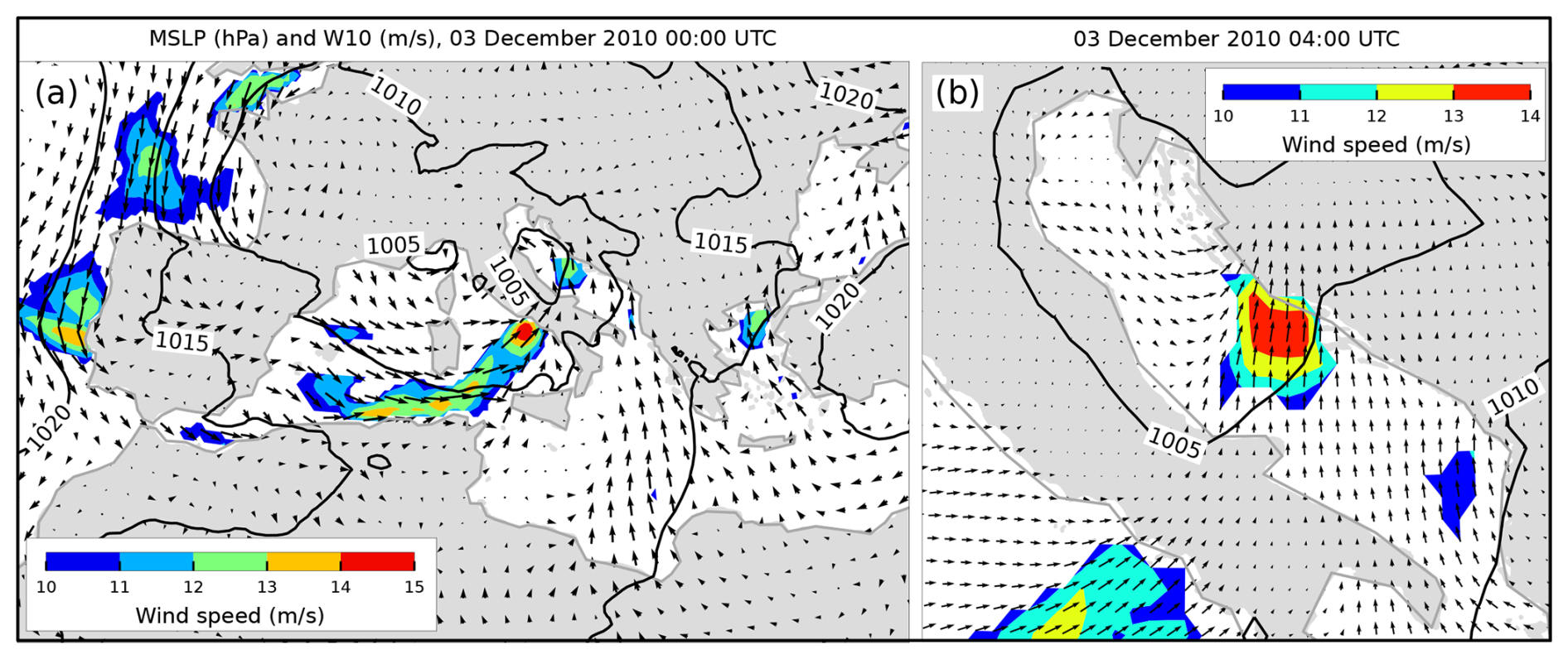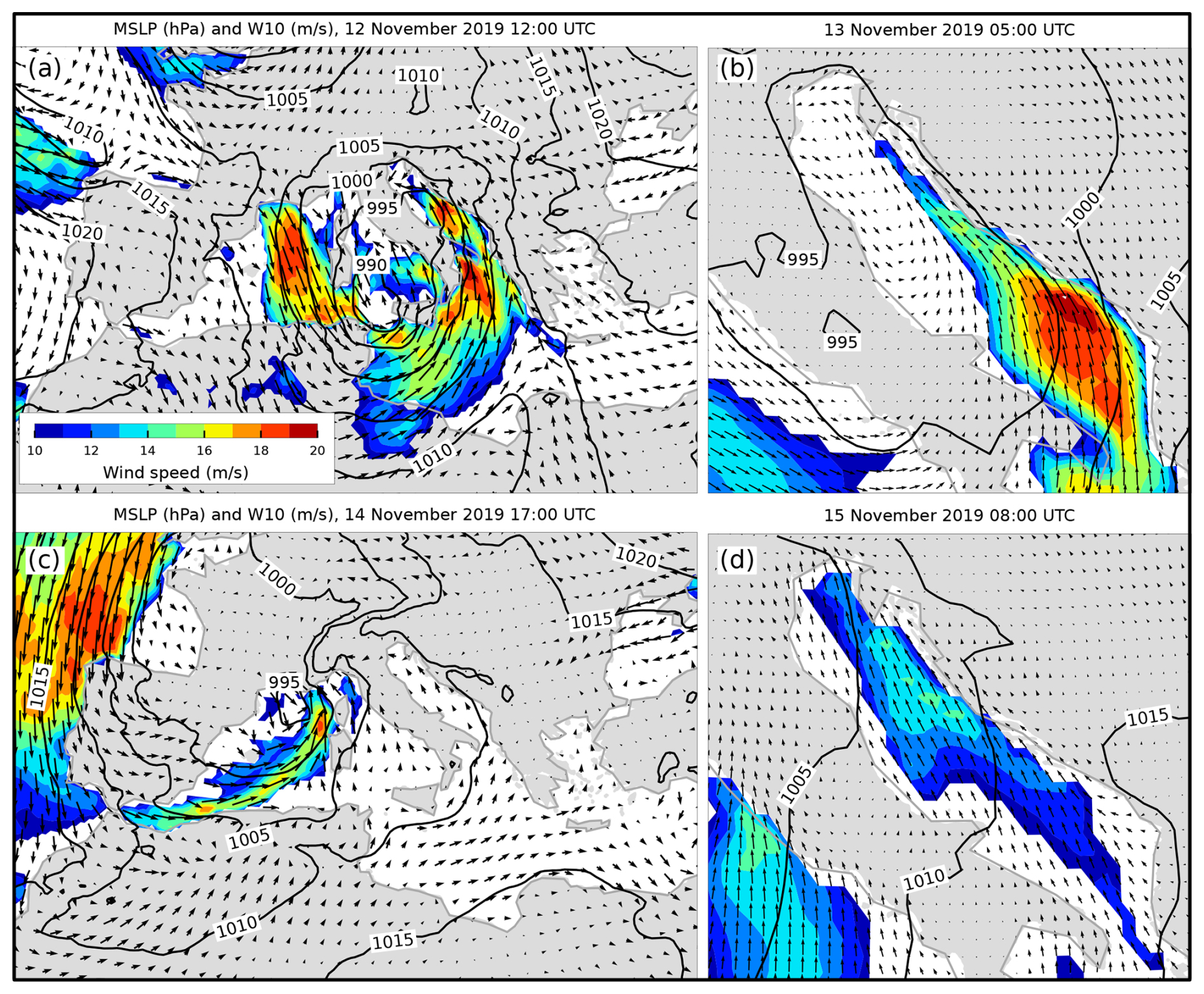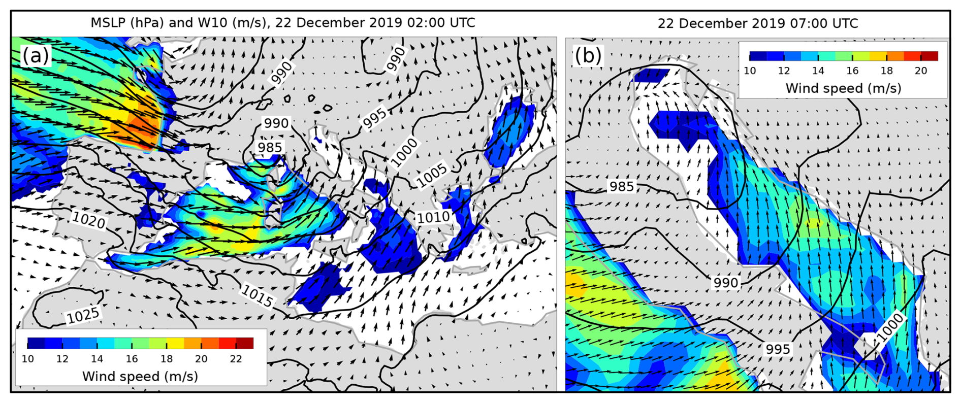 In the days leading up to this episode, weather conditions over the Adriatic were characterised by an air pressure of around 1010 hPa and predominantly southerly winds (Fig. 3). In the upper levels, a southwesterly flow prevailed at the leading edge of a vast trough extending from the Atlantic across western and central Europe to southeastern Europe. Within this trough, as colder air descended from the north towards the British Isles, a surface-based cyclone intensified over Great Britain on 13 and 14 December, with the central air pressure dropping to 985 hPa. At the same time, an upper-level ridge was present over the eastern Mediterranean, accompanied by a surface air pressure of around 1020 hPa. During the night of 14–15 December (Fig. 4a), a new cyclone developed in the Gulf of Lion, quickly moving towards the Tyrrhenian Sea and entering the Adriatic Sea in the early hours of 15 December (Fig. 4b). This situation led to a pronounced MSLP gradient over the Adriatic; as a result, a strong southerly wind developed on 14 December, shifting to strong to gale southwesterly and westerly winds in the evening and during the night of 15–16 December (Fig. 3b) (according to the Beaufort scale, strong wind: 10.8–13.8 m s−1; gale wind: 17.2–20.70 m s−1). Precipitation along the coast was heavier in the northern Adriatic compared to the south: on 15 December, 37 mm was recorded in Rijeka (Trsat); 11 mm was recorded in Novalja (an island near Zadar); and 6 mm was recorded in Hvar (an island near Split).