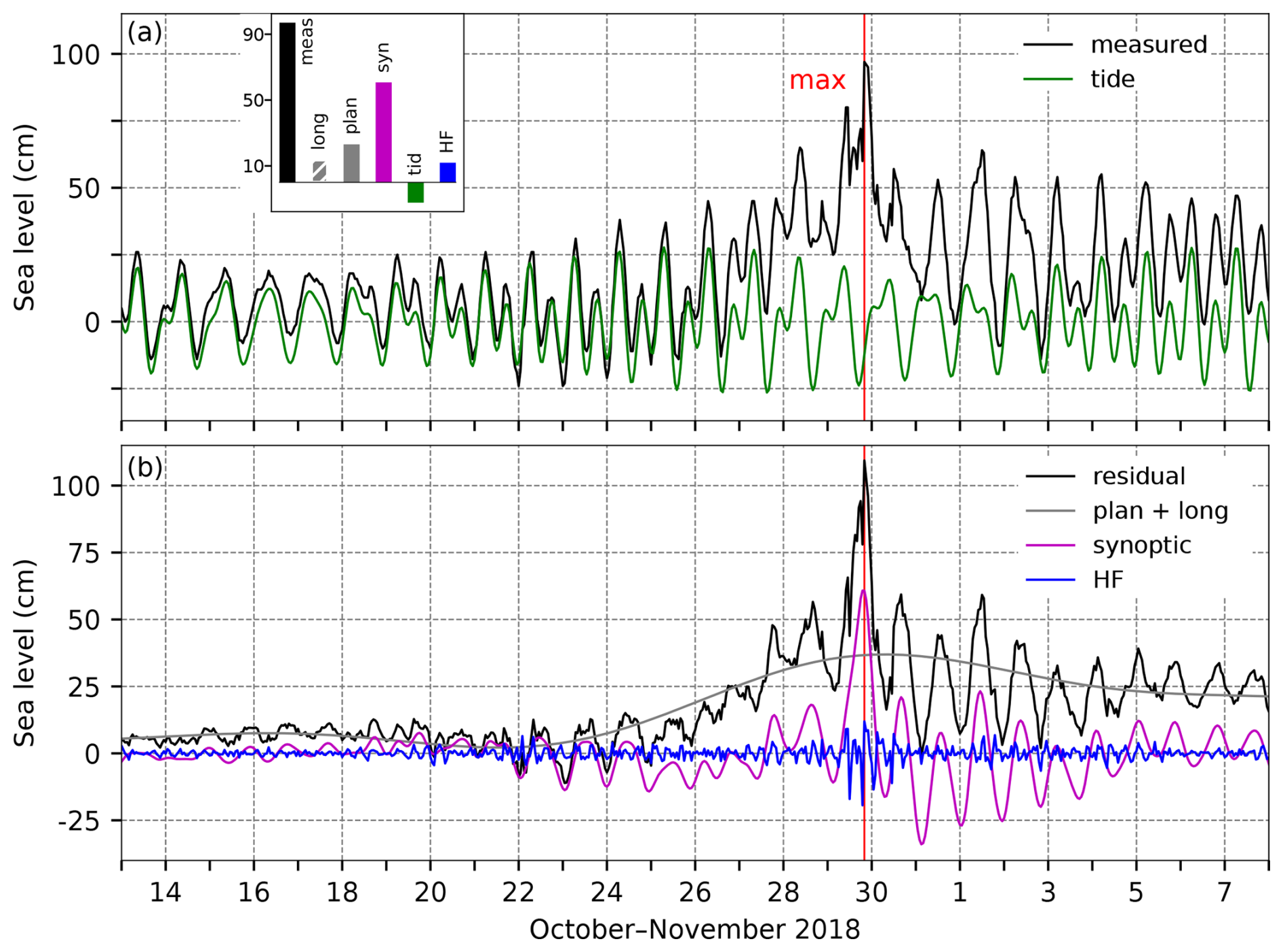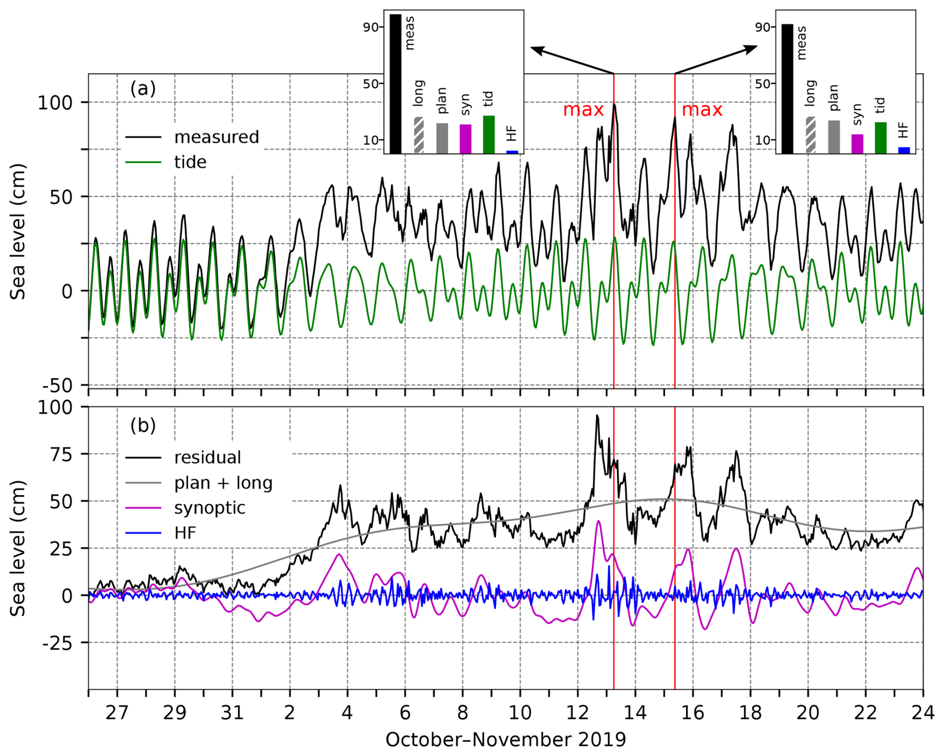 In summary, the floods resulted from the constructive interplay of all contributing processes, except for high-frequency oscillations in the third episode, which had a mitigating effect. Synoptic component was not particularly pronounced, but strong preconditioning played an important role, with all episodes coinciding with the daily tidal maxima.