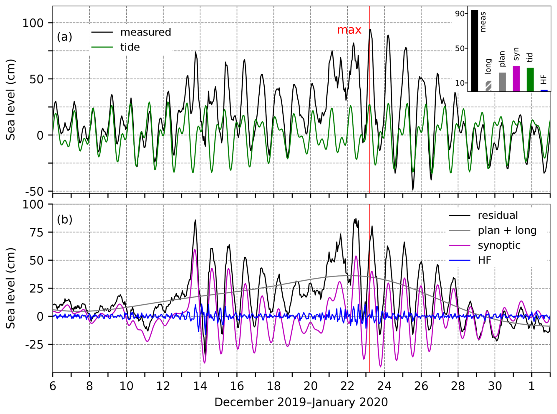 Before the main event, several mild atmospheric disturbances impacted the Adriatic (Fig. 3a), generating basin-wide oscillations (Fig. 5b). The most notable episode of seiches occurred from 6 to 11 December. However, these oscillations were dampened before the main event and consequently, synoptic component during the episode was primarily driven by a storm surge. Atmospheric forcing during the episode was relatively brief, producing only a weak SL response, which was less pronounced than the response to planetary forcing or the tidal influence (Fig. 5a, histogram). Synoptic component contributed 22 cm to the total maximum.