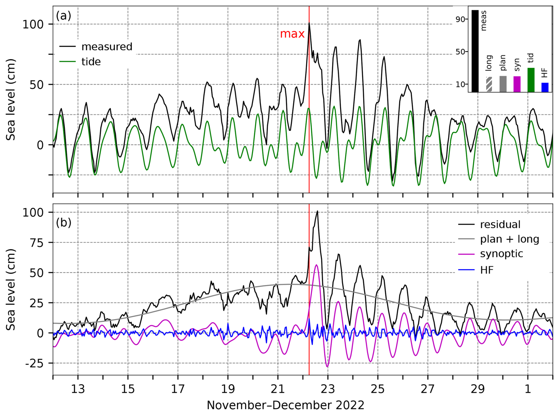 Basin-wide oscillations were evident throughout much of the period (Fig. 8b), initially triggered on 11 December and reinforced for the last time on 16 December, just before the first flood. The first two floods were strongly influenced by pre-existing seiches, while the third was predominantly driven by a storm surge. The  21.2 h period of seiches, combined with the timing of storm-surge set-ups, positively impacted the first two floods, especially the second. The 18 December flood was mainly driven by the seiche, as atmospheric forcing that day was minimal (Figs. 6 and 7c, d). Synoptic component contributed 31, 30, and 27 cm to the floods, respectively.
