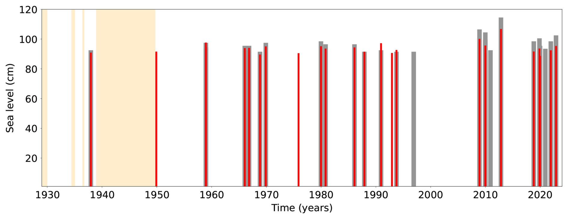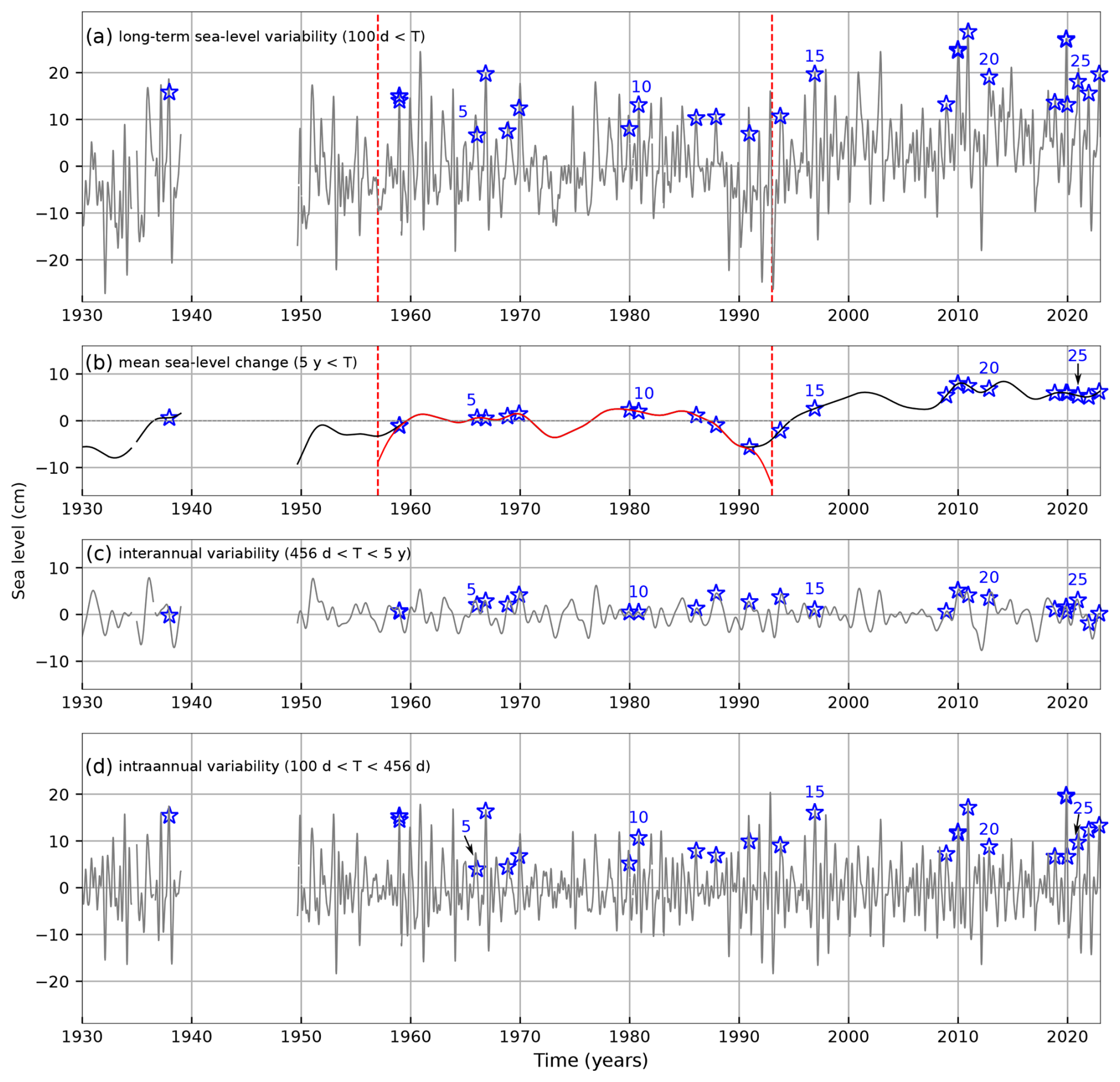 Given the high concentration of extreme episodes at the end of the studied period (seven episodes since 2018), we note that, for these episodes, additional attention should be given to the reliability of long-term sea-level variability, especially in relation to mean sea-level change (5 years <T). Filtering can heavily affect the edges of time series. To check whether this is an issue for our problem, we compared mean sea-level change calculated first for a full interval (1929–2022; black line in Fig. 73b) and then for a shorter interval (1957–1992; red line in Fig. 73b), and we paid special attention to differences between these two series at the edges of the shorter series (1957–1962; 1987–1992). In this way, we get an idea about the length of the unreliable marginal period. From Fig. 73b, it is evident that mean sea-level change is significantly affected by boundary values, especially in situations when sea level is anomalously high or low, as was the case in 1992 (anomalously low).