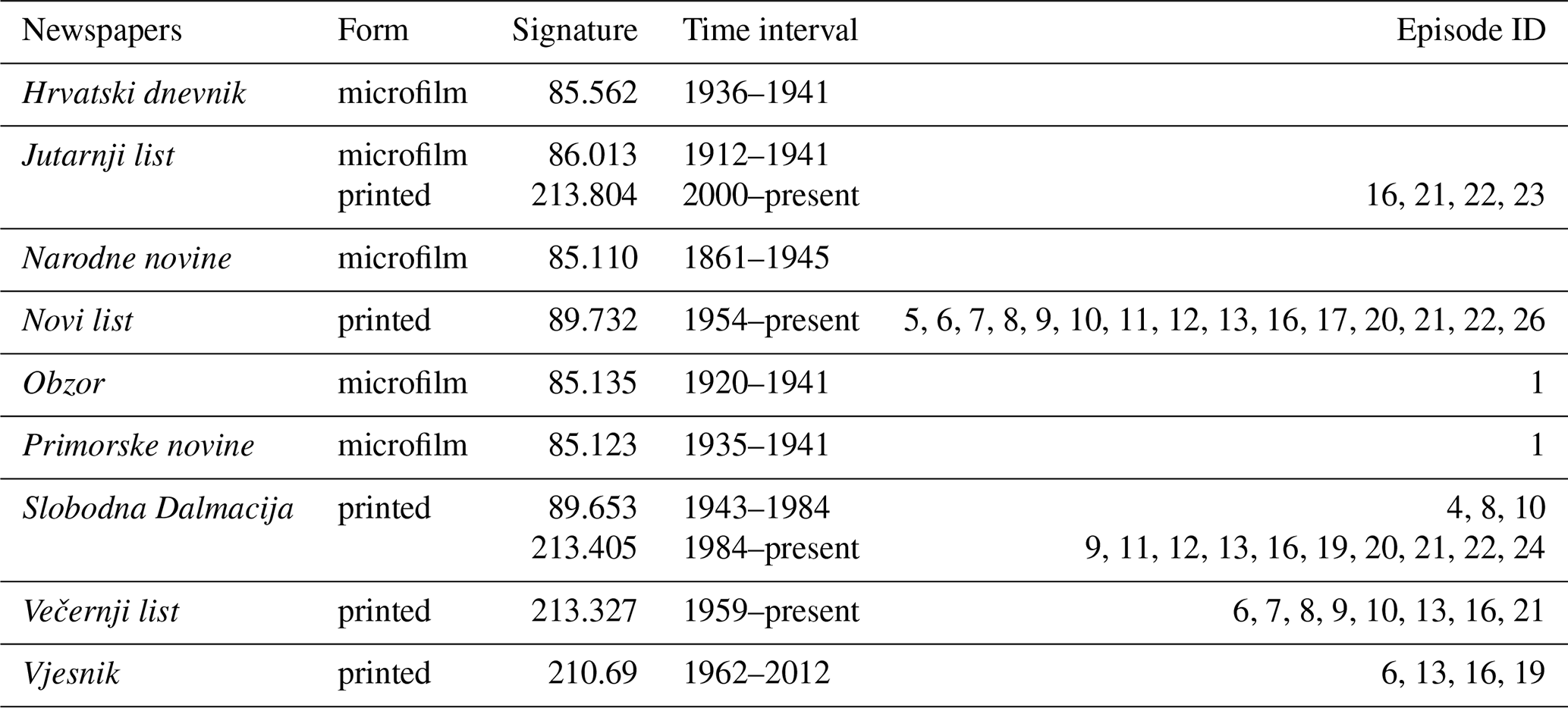 Table 1Title of the serial publication, format of the newspaper (microfilm or print), document ID number (“Signature”, from the National and University Library), publication interval, and corresponding episode IDs (as listed in Table 2) covered in the newspaper reports.