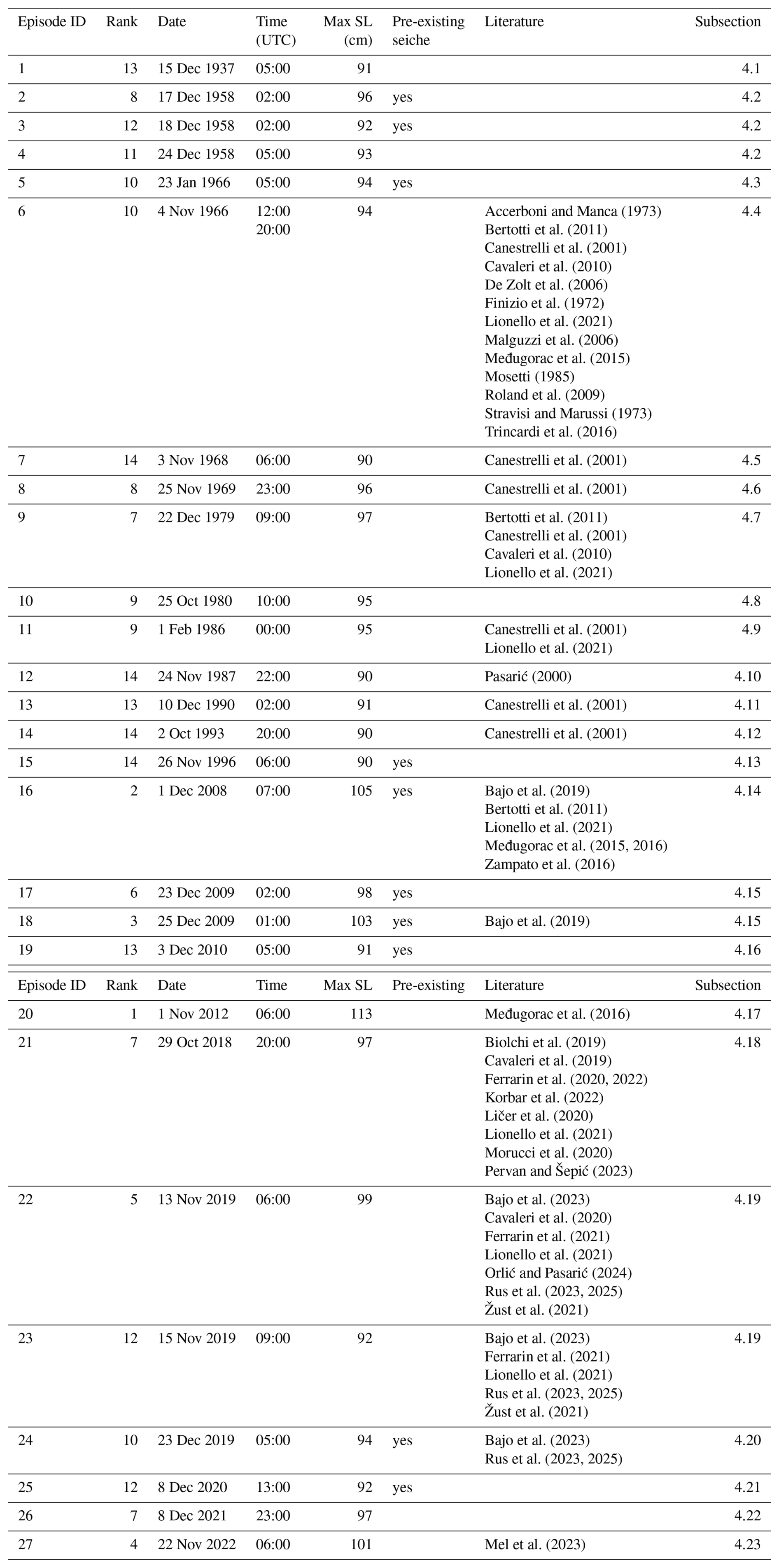 Table 2List of extreme SL episodes recorded at TG Bakar during the 1929–2022 period. Columns, from left to right, include the following: episode ID, episode rank (based on the maximum SL reached), date, time (UTC) of peak SL, maximum recorded SL, presence of pre-existing basin-wide seiches, list of scientific publications that have examined the episodes, and the number of the subsection in which each episode is analysed.
