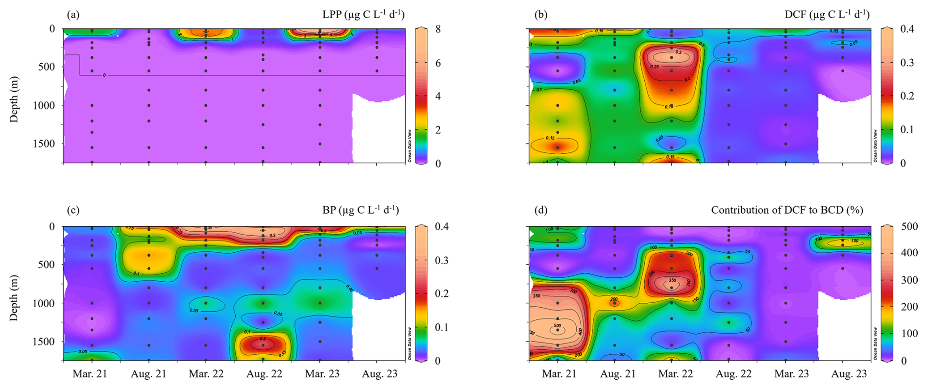 Figure 1Spatial and temporal variability in rates of LPP (a), DCF (b), BP (c) and the contribution of DCF to bacterial carbon demand (BCD) (d) at the offshore SE Mediterranean Sea (Lat. 33.15° N, Lon. 34.16° E) between 2021–2023. BCD was calculated assuming a bacterial gross efficiency of 0.20 (Gasol et al., 1998). (Figure originates from Ocean Data View; Schlitzer, 2025.)