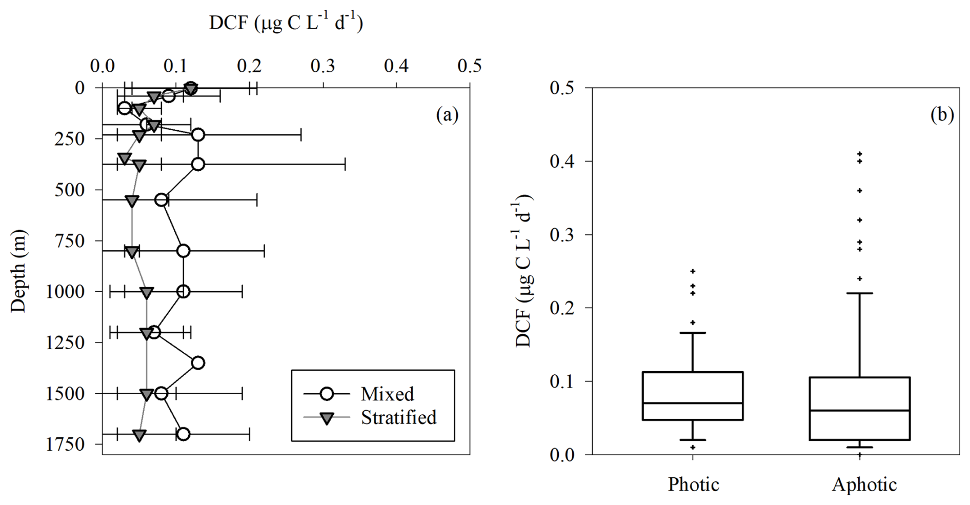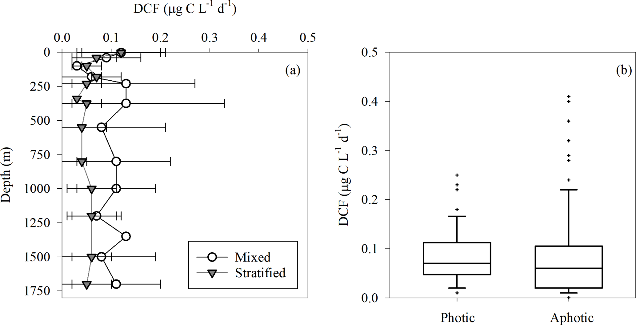The higher aphotic DCF in the mixed versus the stratified periods may be related to more bioavailable carbon that is transported from the photic layer as marine snow and supplies organic carbon to heterotrophic activity in the winter (coinciding higher LPP). However, given the oligotrophic nature of the southeast Mediterranean Sea (Berman-Frank and Rahav, 2012; Reich et al., 2022), most of the organic carbon (both particulate and dissolved originating from LPP) is recycled within the photic layer. Only a small fraction fluxes down to the aphotic zone and has been recorded in sediment traps (Alkalay et al., 2024).