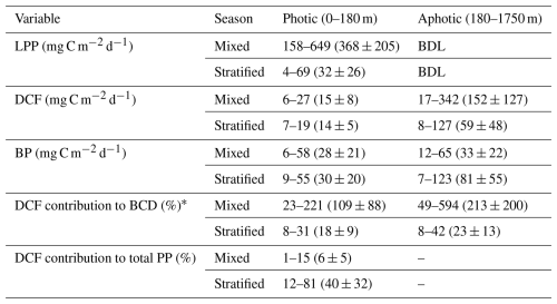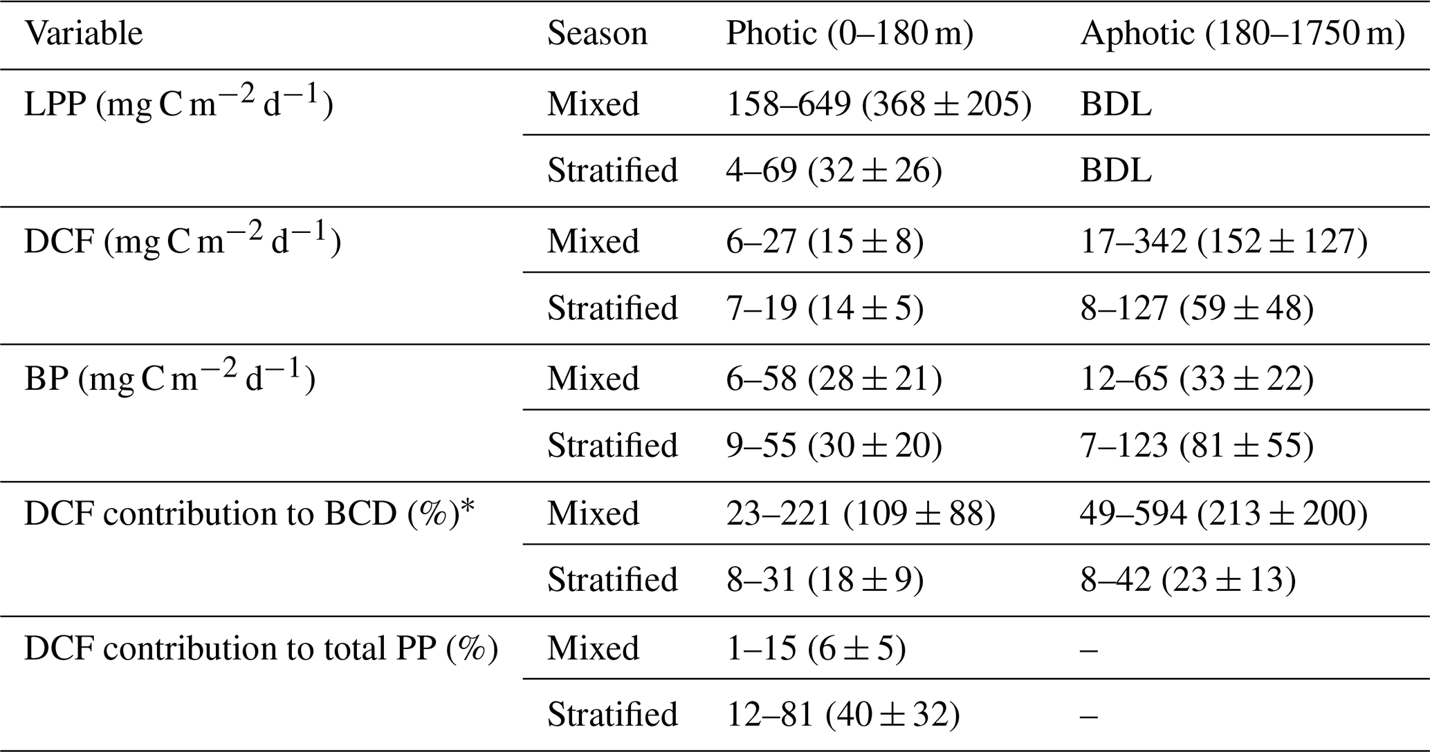 Table 1Depth-integrated rates and contribution of DCF to metabolic processes in the photic (0–180) and aphotic (>180 m) depths of the pelagic southeast Mediterranean Sea. The values represent the minimum and maximum ranges observed across the cruises, with the averages and their corresponding standard deviations provided in parentheses. BDL = Below detection limit.