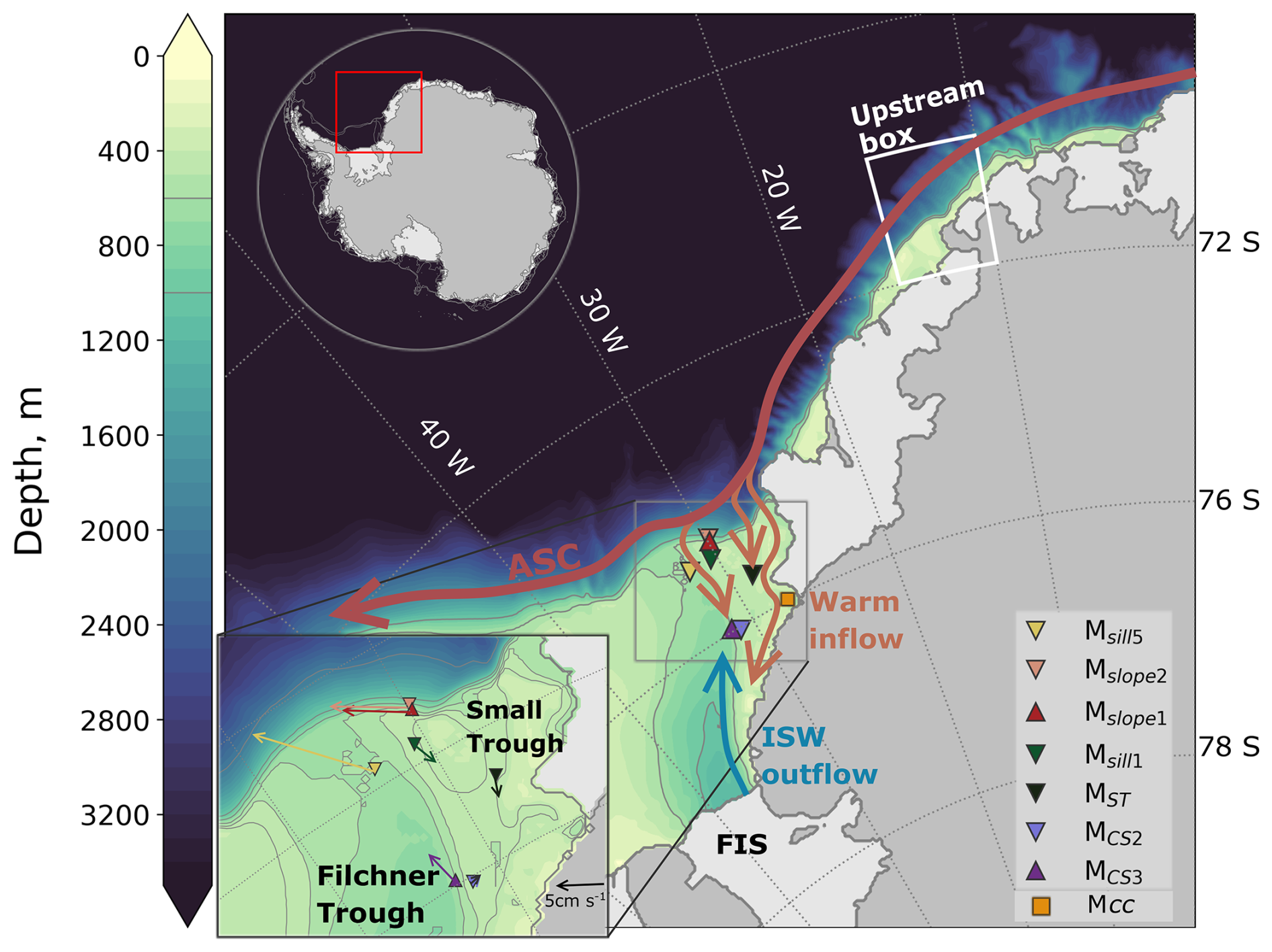 Figure 1Map over the study area showing the mooring locations (colored markers), the main currents (Nicholls et al.2009; Darelius et al.2014) and the “Upstream box” used to estimate the ocean surface stress. The bathymetry (color and gray contours) and the floating ice shelves (light gray) are from Bedmap2 (Fretwell et al.2013). Filchner Trough, the Small Trough, Filchner Ice Shelf (FIS), the Antarctic Slope Current (ASC), the warm inflow and the Ice Shelf Water (ISW) outflow are labeled. The red box in the upper inset indicates the study region. The lower inset shows the vertically averaged current at the mooring locations.