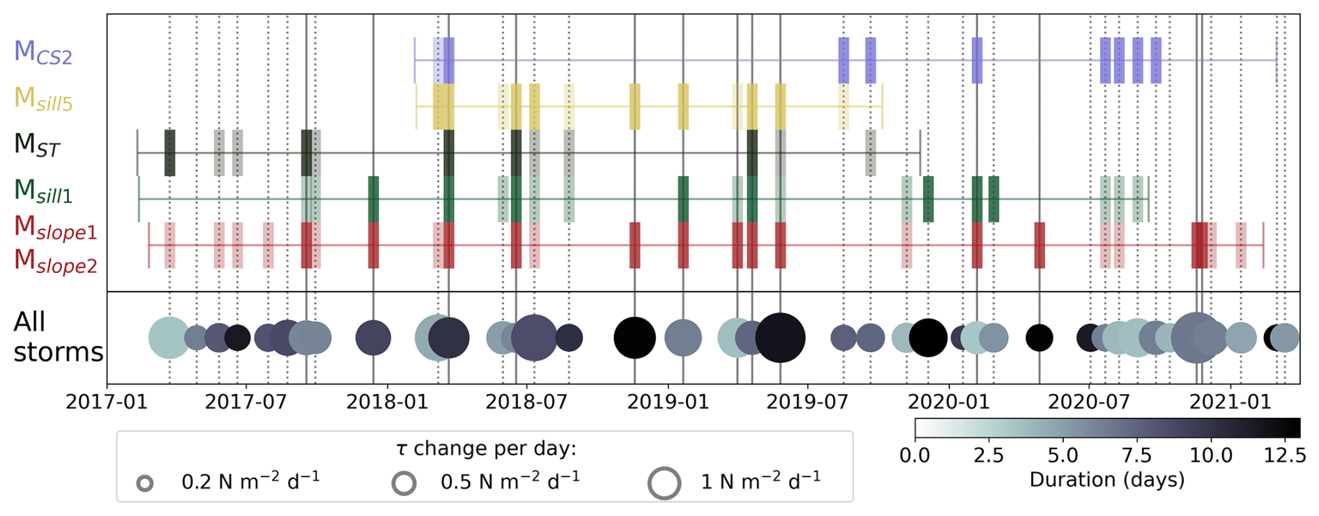 Figure 3Overview of storms (dashed and solid vertical black lines) and storm responses (colored vertical bars) at the moorings. Horizontal lines show the duration of the mooring records, and dark colored vertical bars indicate a significant storm response. Light vertical bars show storm responses stronger than the 70th percentile of background current increase (see methods Sect. 2.5). Storms with a significant response at both Mslope1 and Mslope2 are shown as solid, black vertical lines. The gray circles indicate the duration (color) and change in ocean surface stress, τ, per day (size) for the identified storms.
