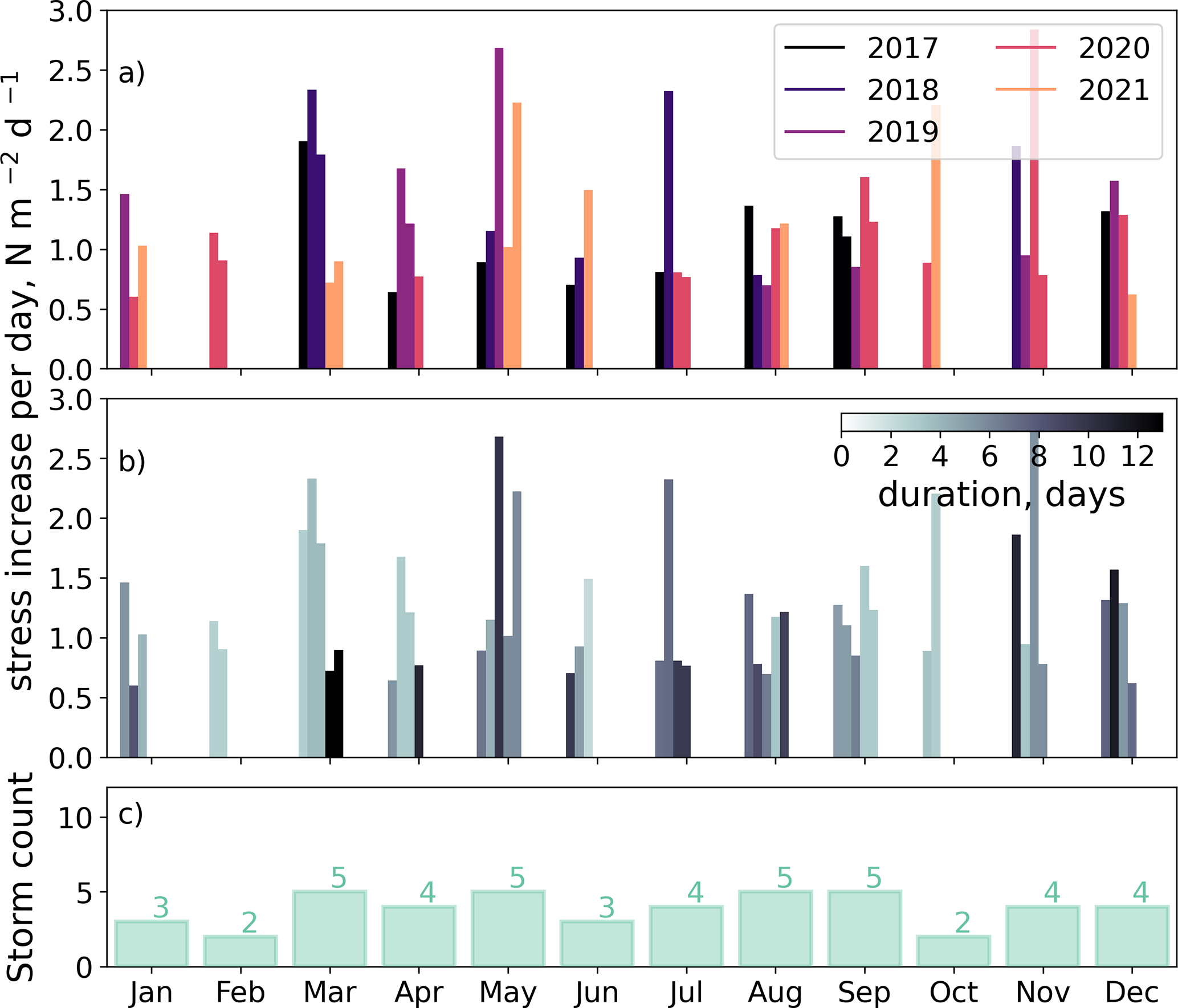 Figure 4Storm statistics between January 2017 and December 2021. Panels (a) and (b) show the increase in ocean surface stress per day for the identified storm on the y-axis, with (a) year and (b) storm duration in color. Panel (c) shows the total number of storms per month.