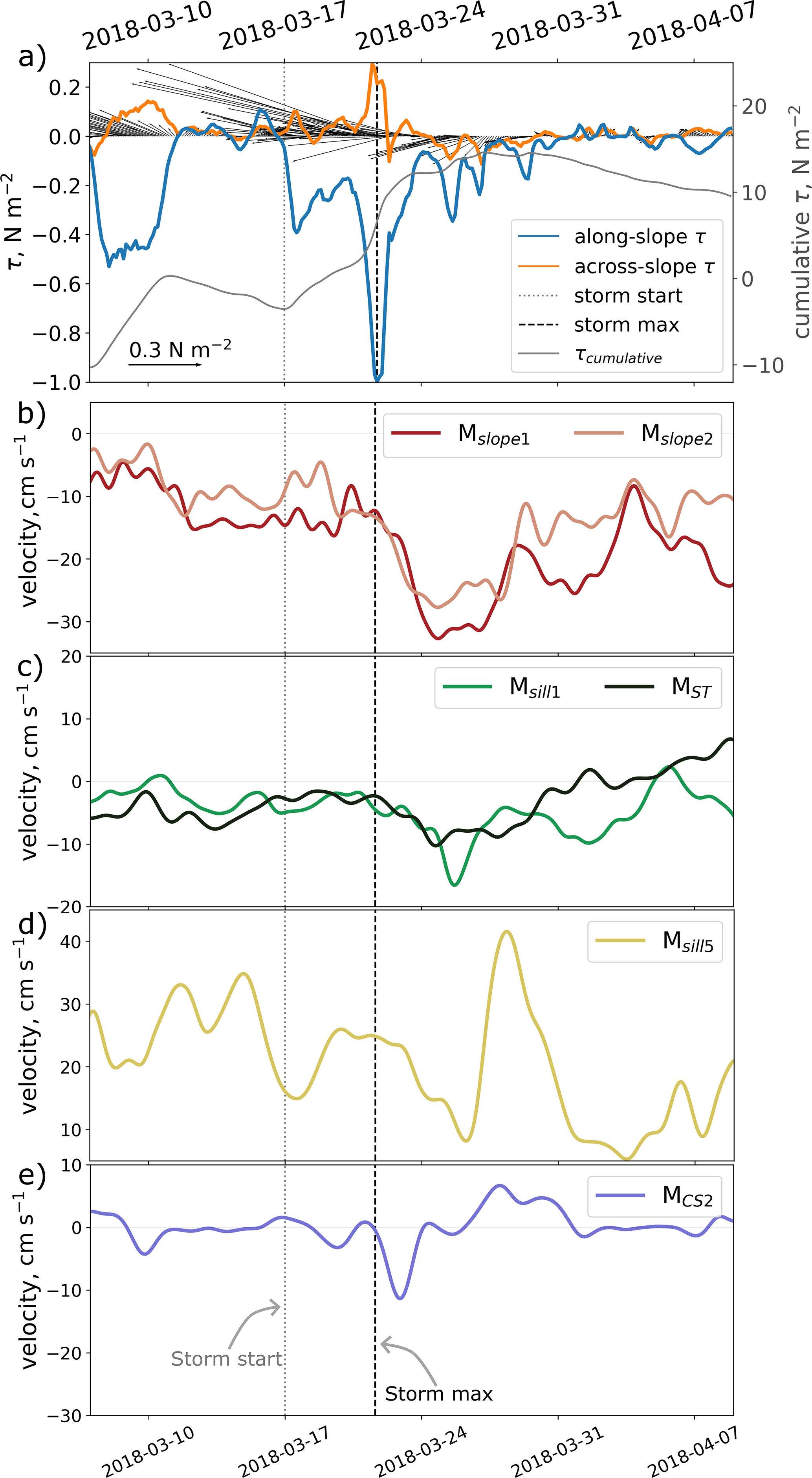 Figure 5The response to the storm event that started on the 17 March 2018 (dotted, gray vertical line) and reached maximum ocean surface stress, τmax, on the 22 March 2018 (dashed, black vertical line). Time series of (a) ocean surface stress (τ) averaged over the Upstream box (black sticks), the strength of the along-slope (blue) and cross-slope (orange) components, and the cumulative along-slope τ (gray, de-trended and 180 d high-pass-filtered). The along-flow current speed at (b) Mslope1 (red) and Mslope2 (pale red), (c) Msill1 (green) and MST (gray), (d) Msill5 (yellow), and (e) the current speed following the bathymetry at MCS2 (purple). See Fig. 1 for mooring locations.