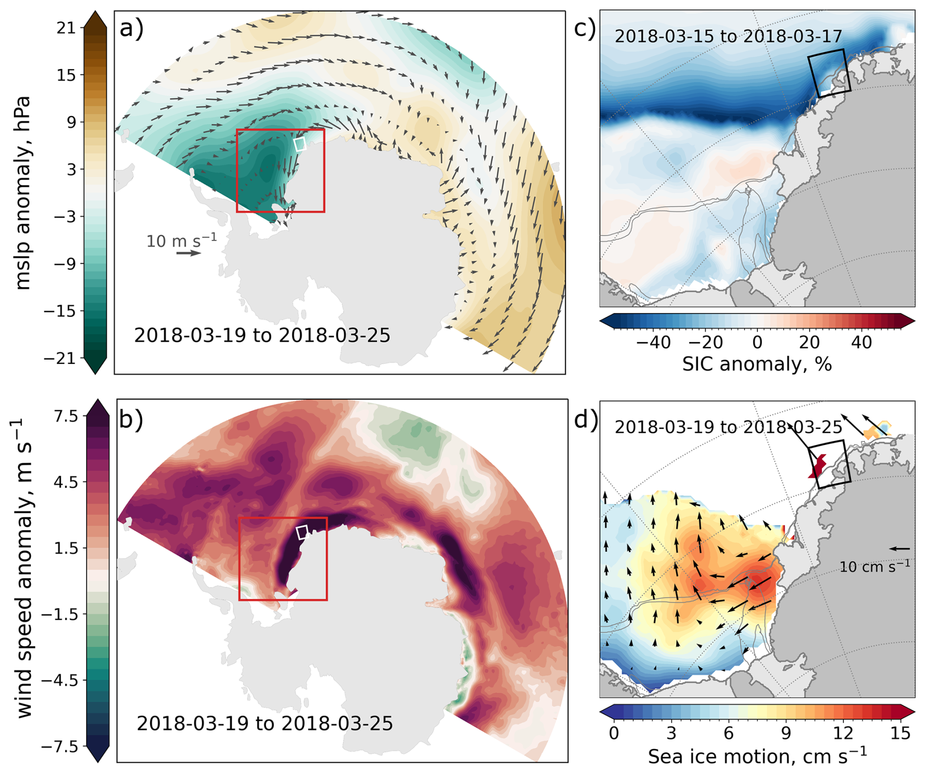 Figure 6The atmospheric and sea ice conditions during the storm that started on the 17 March 2018 and reached maximum ocean surface stress, τmax, on the 22 March. Anomalies of the (a) mean sea level pressure with 10 m wind velocity vectors and (b) absolute 10 m wind speed averaged ±3 d of τmax relative to the average March field (1990–2023). (c) Sea ice concentration averaged over the two days before the storm starts relative to the climatology (past 30 years). (d) Sea ice velocity (Tschudi et al.2020) averaged ±3 d of τmax. White regions indicate missing data or areas without sea ice. In (a), (b), the Upstream box and the region shown in (c), (d) are indicated, and in (c), (d), the 1000 and 600 m isobaths are indicated by gray lines (Fretwell et al.2013). Sea ice concentrations, pressure, and 10 m wind data are from ERA5 (Hersbach et al.2023).