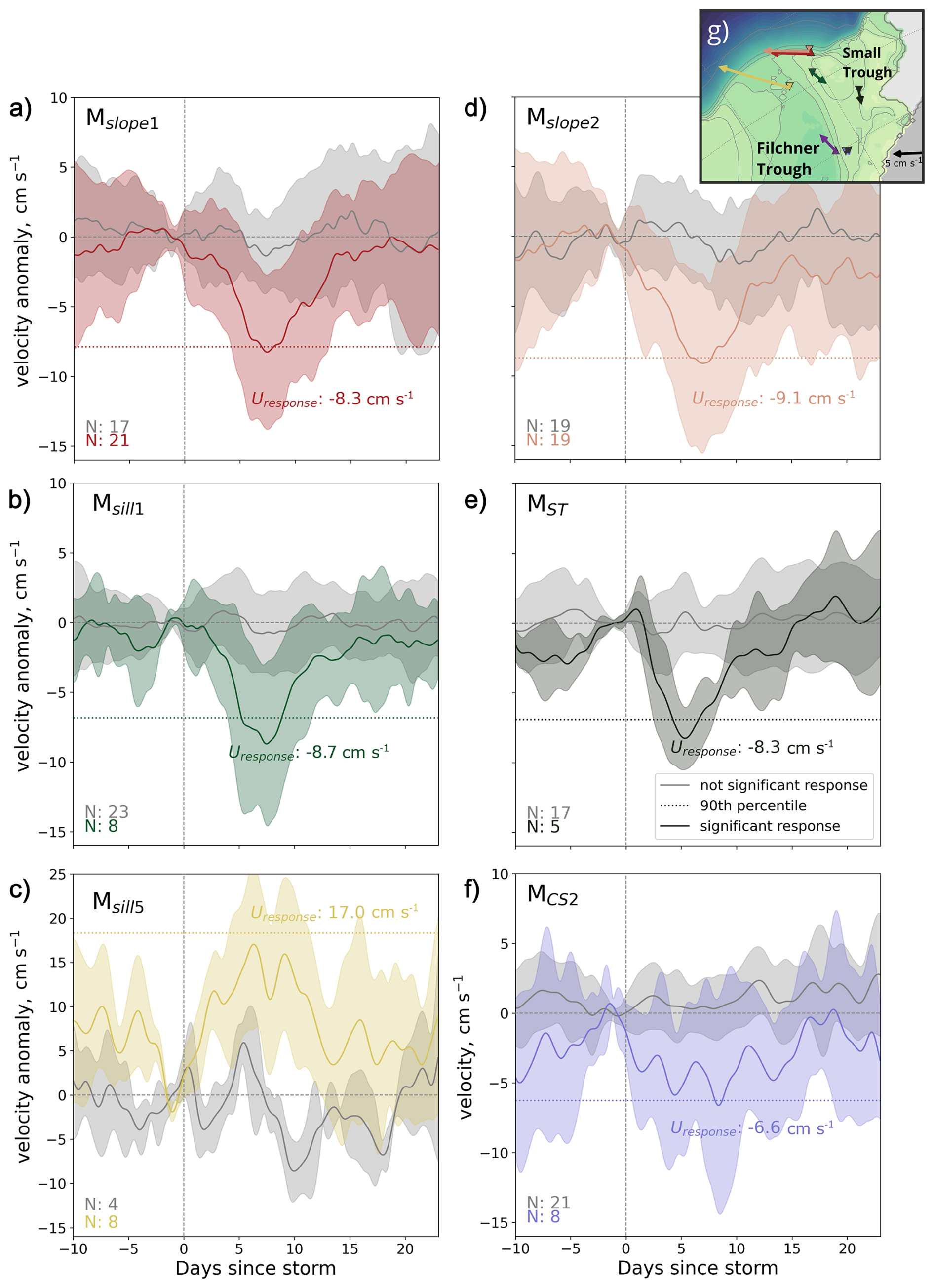 Figure 7The composite average storm response at (a) Mslope1, (b) Msill1, (c) Msill5, (d) Mslope2, (e) MST, and (f) MCS2. In each panel, the average response (line) and the standard deviation (area) to storms that give a significant response are shown in color, while the average current following storms that do not give a significant response is shown in gray. The legend in (e) is common for all panels. The threshold for significance (see Table 1, horizontal colored, dotted lines) and the number of events (N) included are indicated. Day zero is the start of the period used to estimate Uresponse, i.e., t0−3 d (see Fig. A1). We only include the events where we have data for the 33 d shown in each panel. The map in the upper corner (g) shows the mooring locations and the mean current directions.