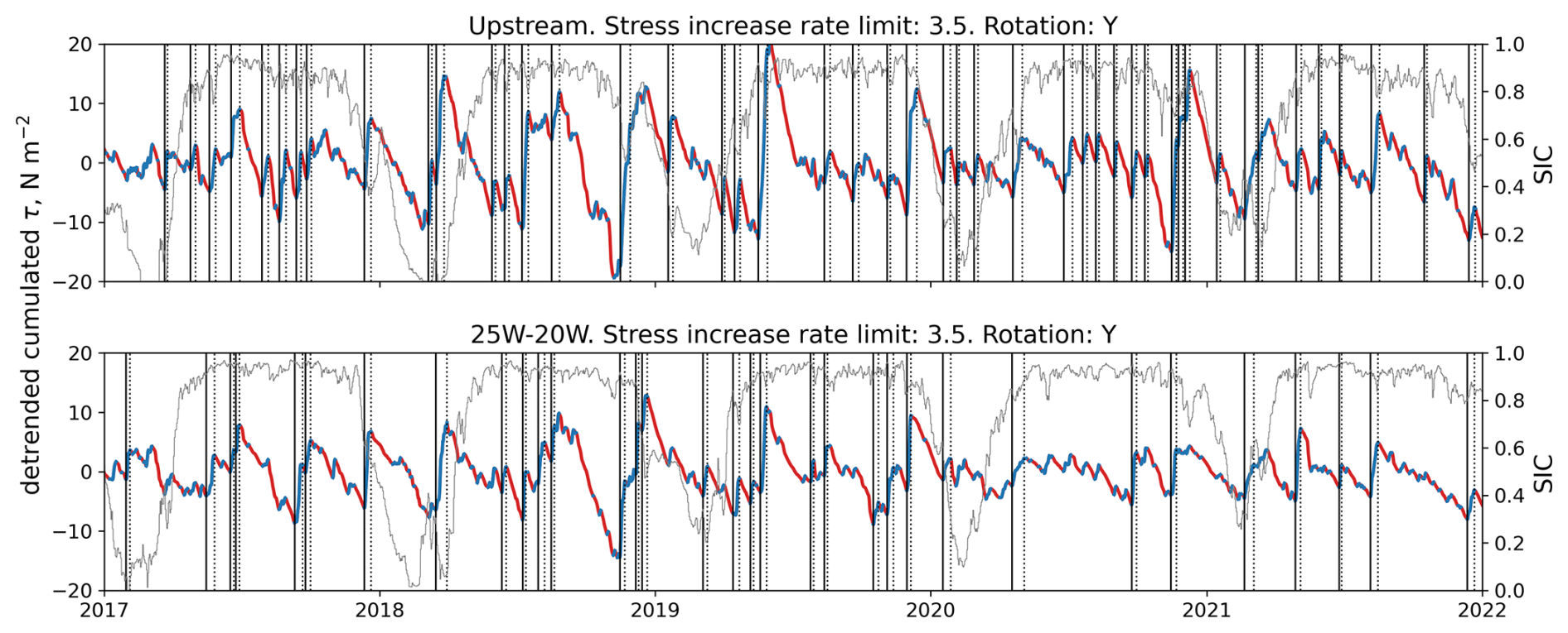 The following procedure is used to identify events of strong ocean surface stress, “storms”. We de-trend the records of along-slope ocean surface stress and apply a high-pass filter (4th order 180 d Butterworth filter) to remove the seasonality. We then identify storm events as periods when the cumulative stress increases monotonically for more than 12 h and where the total increase is at least 3.5 N m−2. We thus disregard the shortest and weakest wind events from further analysis, as we do not expect them to cause increased circulation (Dundas et al.2024). Two storm events are combined if they are less than 15 h apart. This condition is based on idealized model results, which indicate that the circulation increases throughout the storm duration and stays enhanced for a few days after the storm has passed (Dundas et al.2024). This means that a storm that occurs shortly after another adds momentum to an already enhanced current field.