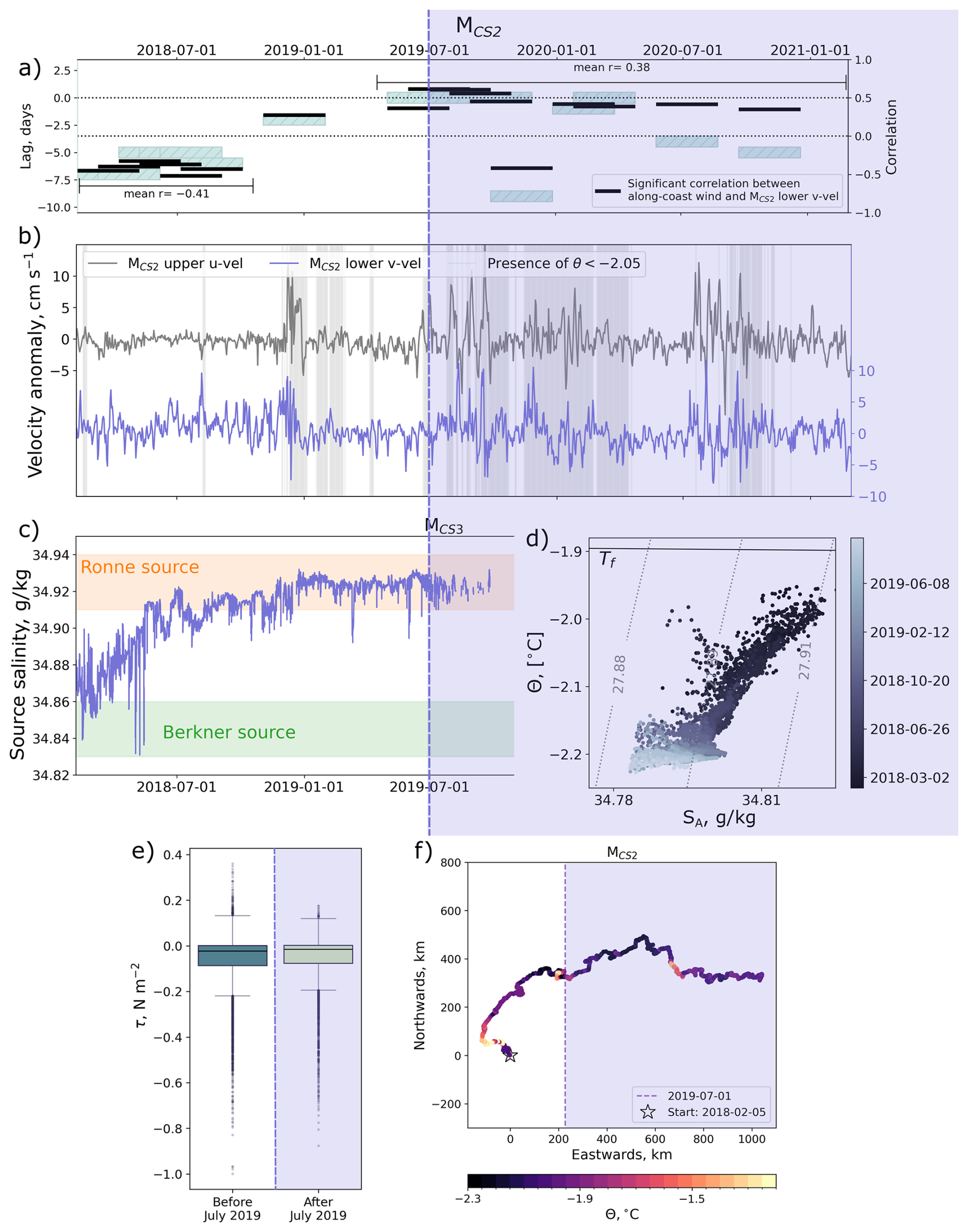Figure B1Indications of a shift around 2019 in the southeastern Weddell Sea shelf region. Panels (a)(c) have a shared x-axis, the purple background indicates the period after 1 July 2019. (a) Time series from MCS2 of 90 d long, 33 % overlapping windows of significant correlation (0.95 significance level, black bars) and lag (blue bars) between the along-coast wind and the southward bottom current, following Sciremammano (1979) (24 h–30 d bandpass filtered. Positive correlation: roughly south-westward wind corresponds to current toward Filchner Ice Shelf). (b) Current anomalies at MCS2; eastward component at the upper sensor (gray) and the northward component at the lower sensor (purple) with gray shading when water colder than θ=-2.05 °C is present. (c) The estimated ISW source water salinity at MCS3 with approximate ranges of Berkner (green shading) and Ronne (orange shading) mode source waters (Hattermann et al.2021). (d) ΘSA-diagram from MCS3 colored by time. For clarity, we have omitted observations with σ<27.885 kg m−3 in panels (c) and (d). (e) Box plots of the along-slope ocean surface stress before (blue) and after (green) July 2019. (f) Progressive vector diagram of the current at the bottom sensor of MCS2 colored by temperature. The temperature is based on the average absolute salinity (at the nearest sensor level) because the salinity sensor stopped recording in early 2020. The start of the time series (star) and the 1 July 2019 (dashed line) are indicated.