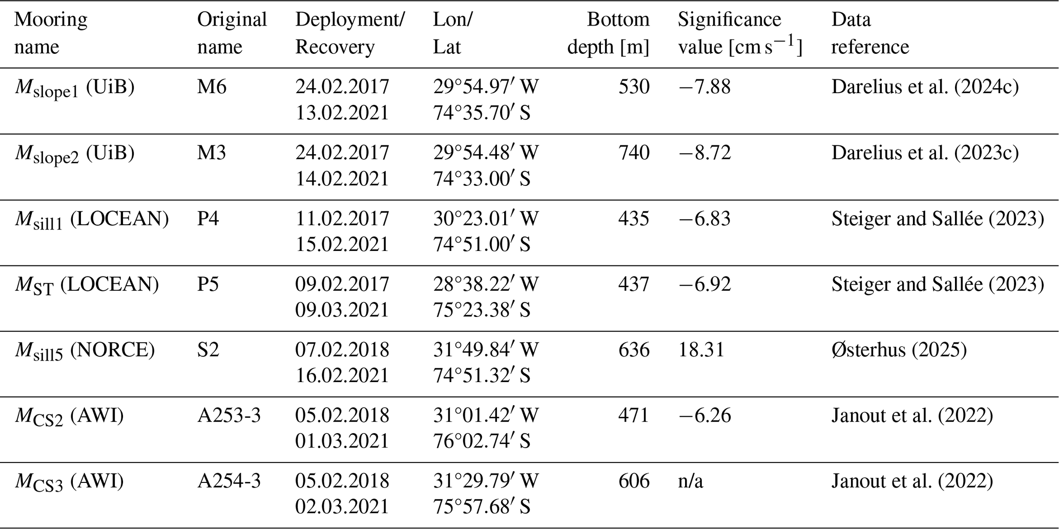 Table 1Overview of the moorings. The indicated significance limits (Sect. 2.5) for storm response are negative for all moorings except Msill5 because their main observed flow directions have a strong westward or southward component. The significance value at Msill5 is positive because the main flow direction has a strong northward component. No significance value is indicated for MCS3 because this mooring is dominated by northward flowing ISW and not used in the storm response analysis. Information about instruments, calibration, and data processing can be found in the indicated data reference. n/a: not applicable.