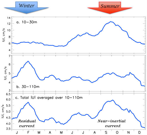 The seasonal signal is the dominant component of Arctic atmospheric, sea ice, and oceanic variability. The winter winds, which are typically stronger than the summer winds (Fig. 4), should be the primary cause of this variability in the upper ocean currents. Indeed, surface-intensified upper ocean currents provide evidence that the atmospheric forcing dominates, particularly in summer (Fig. 2). At the same time, the ocean's response to this seasonal forcing is not straightforward due to a host of mechanisms and processes involved. For example, summer currents, not winter ones, are stronger in the upper 30 m SAO due to (at least partially) the isolating effect of compact winter sea ice (Figs. 2, 3 and 6).