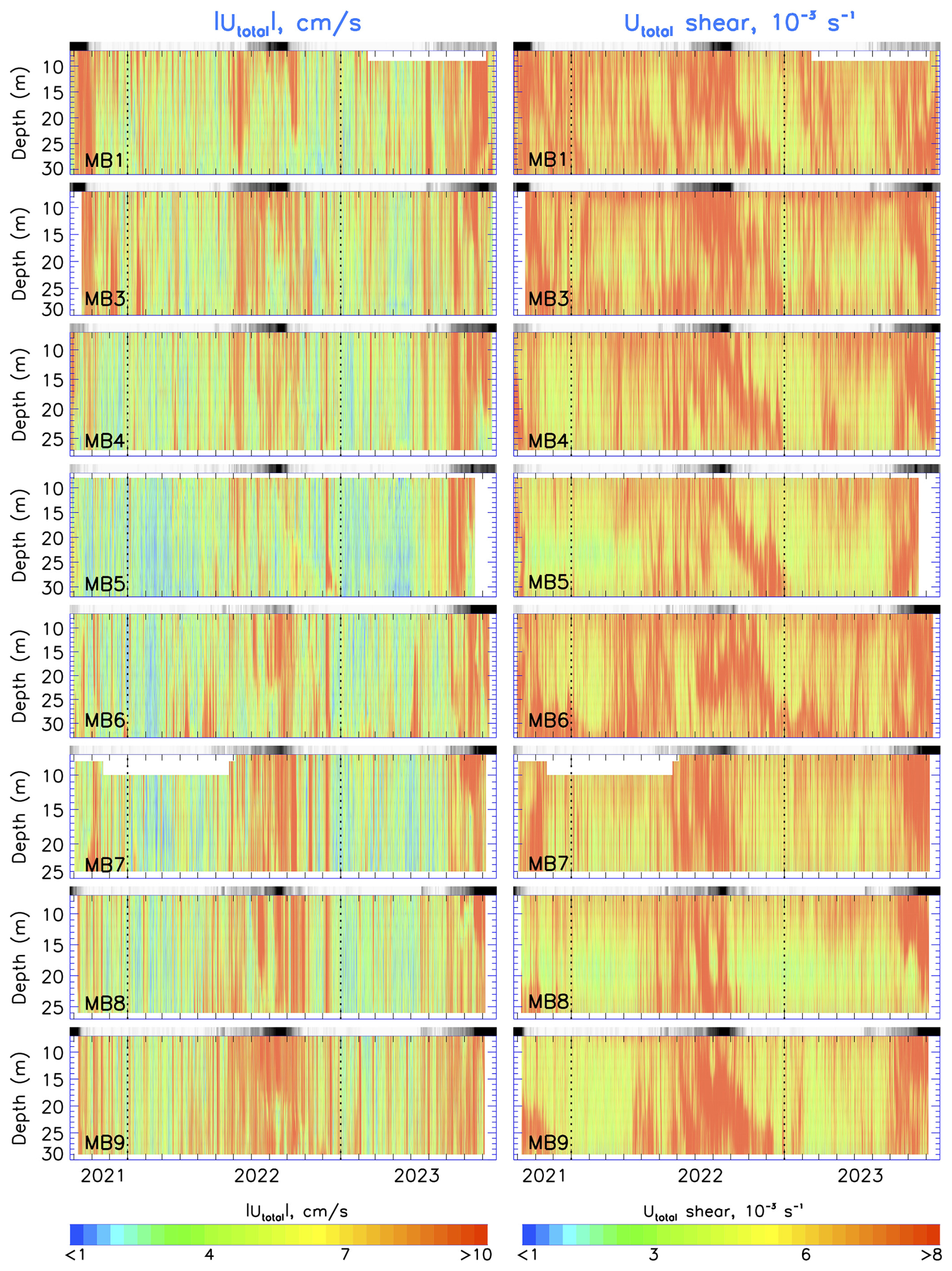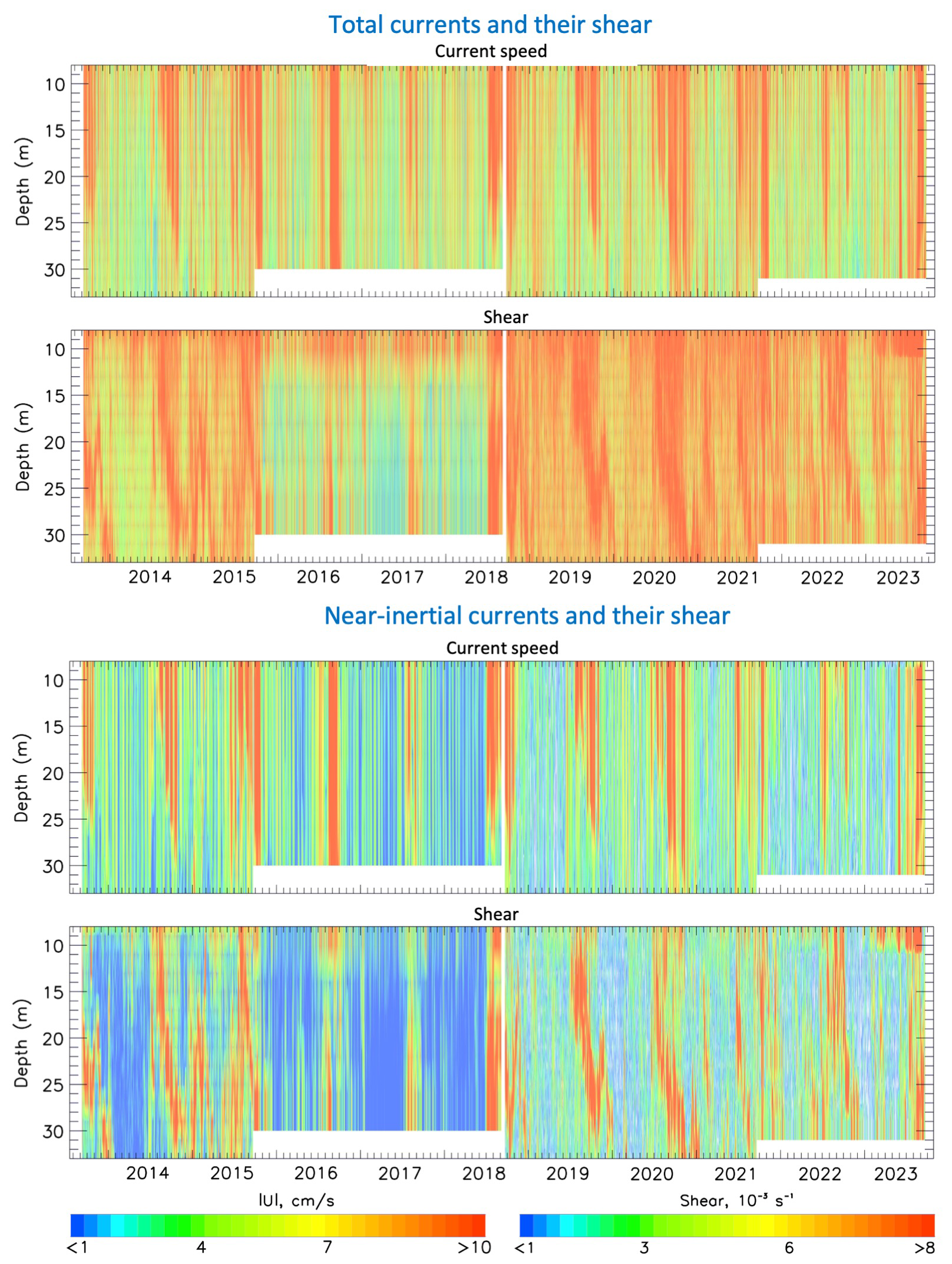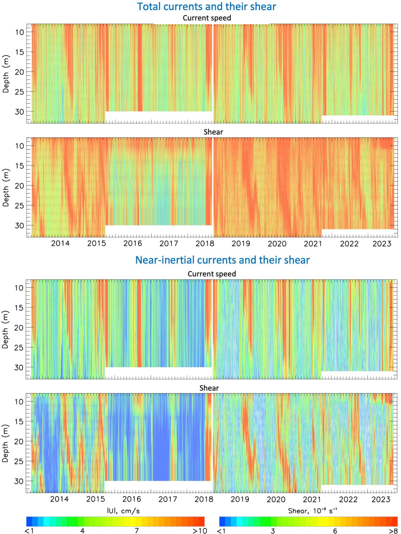 Figure 7September 2013–September 2023 record of the total and semidiurnal-band (near-inertial) current speed (cm s−1) and associated shear (103 s−1) at MB1 mooring location (see Fig. 1 for mooring position) as a function of time and depth. White segments show missing data.