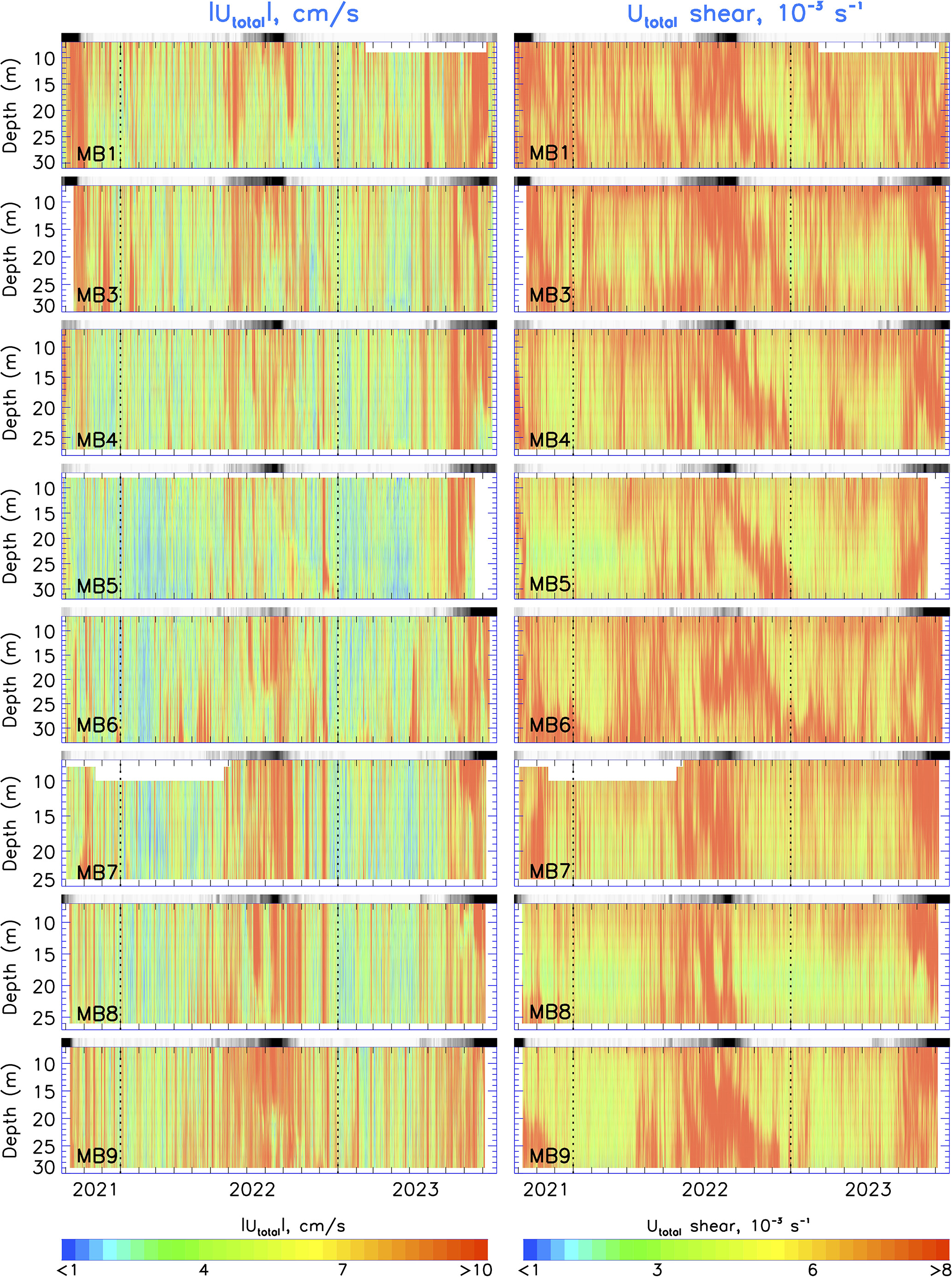 Vertical shear of horizontal currents: The vertical shear utilizing ADCP and MMP current observations was calculated using the central finite difference method (when the shear at a vertical grid point is proportional to the difference between the velocities of two nearby, shallower and deeper, grid points), which produced a 4 m vertical scale for the shear estimates.