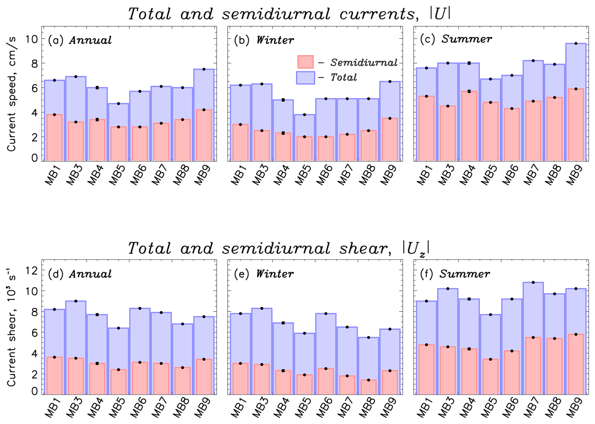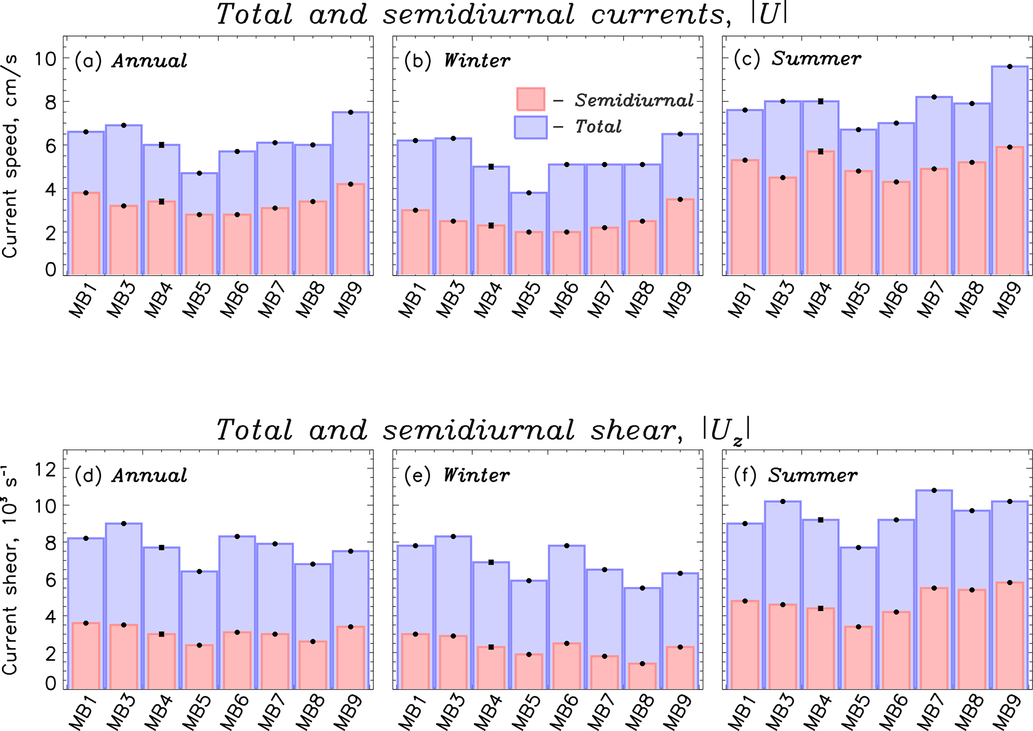 Figure 3Temporal changes in total (blue) and semidiurnal-band (near-inertial, red) currents and their shear from September 2021 to September 2023 in the upper 30 m for eight locations in the Siberian Arctic. Estimates of (a, d) annual (January–December), (b, e) winter (November–July), and (c, f) summer (August–October) for mean current speed and vertical shear of horizontal currents respectively, at eight mooring locations. Statistical significance of means (error bars) is shown at the 95 % confidence level.