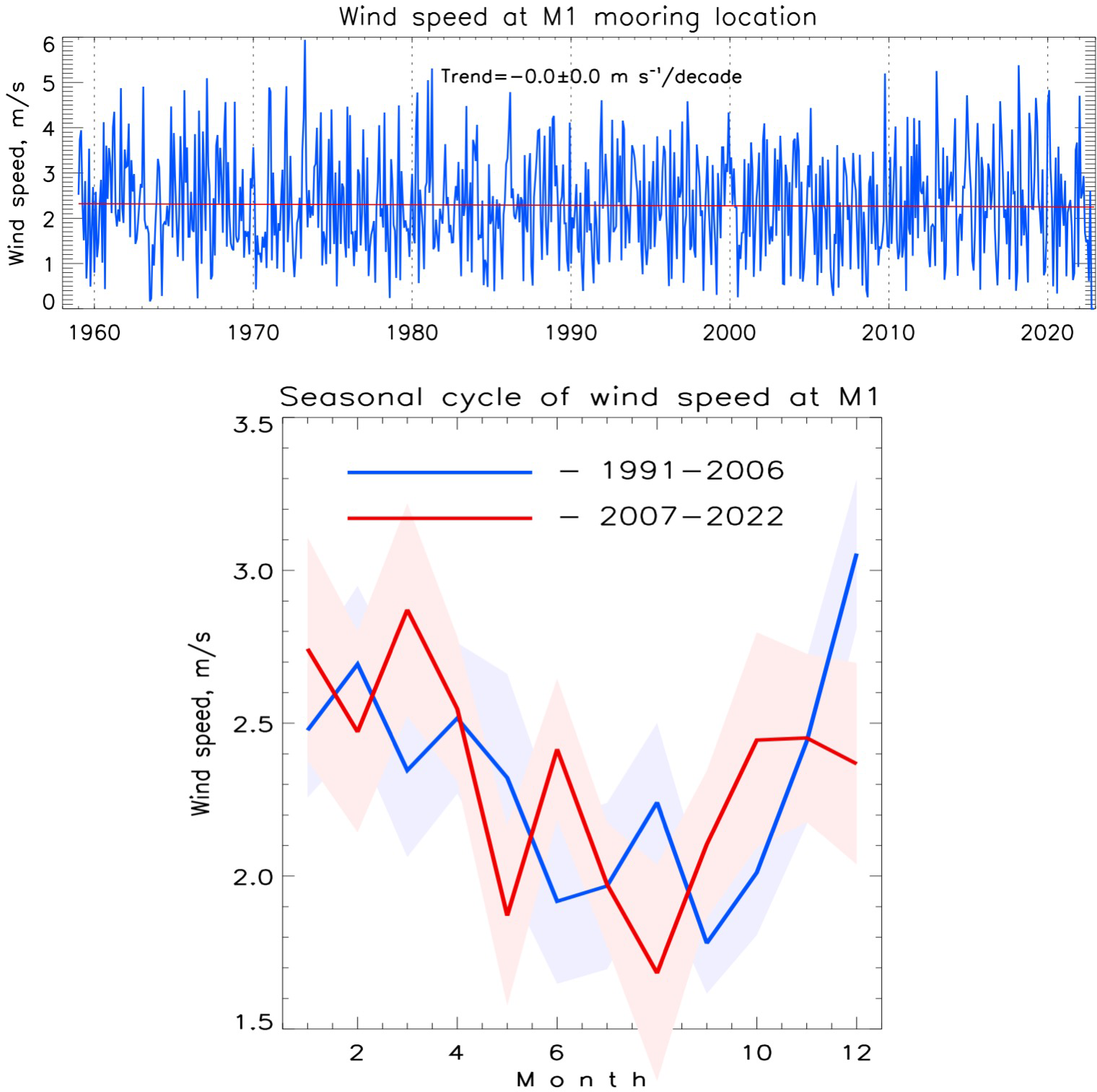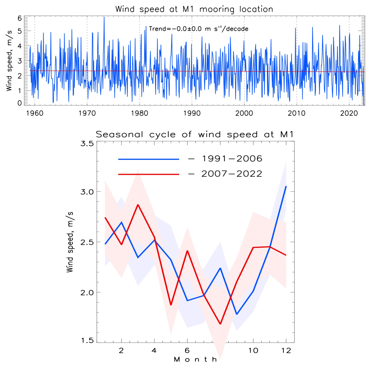 Figure 4(Top) 1958–2023 time series of wind speed from monthly ERA-5 reanalysis for the MB1 mooring location. (Bottom) Seasonal cycle of wind speed at the MB1 mooring location averaged over 1991–2006 (blue) and 2007–2022 (red). Shades represent 1 S.E. uncertainty. Note negligible trend and statistically insignificant temporal changes in seasonal cycles.