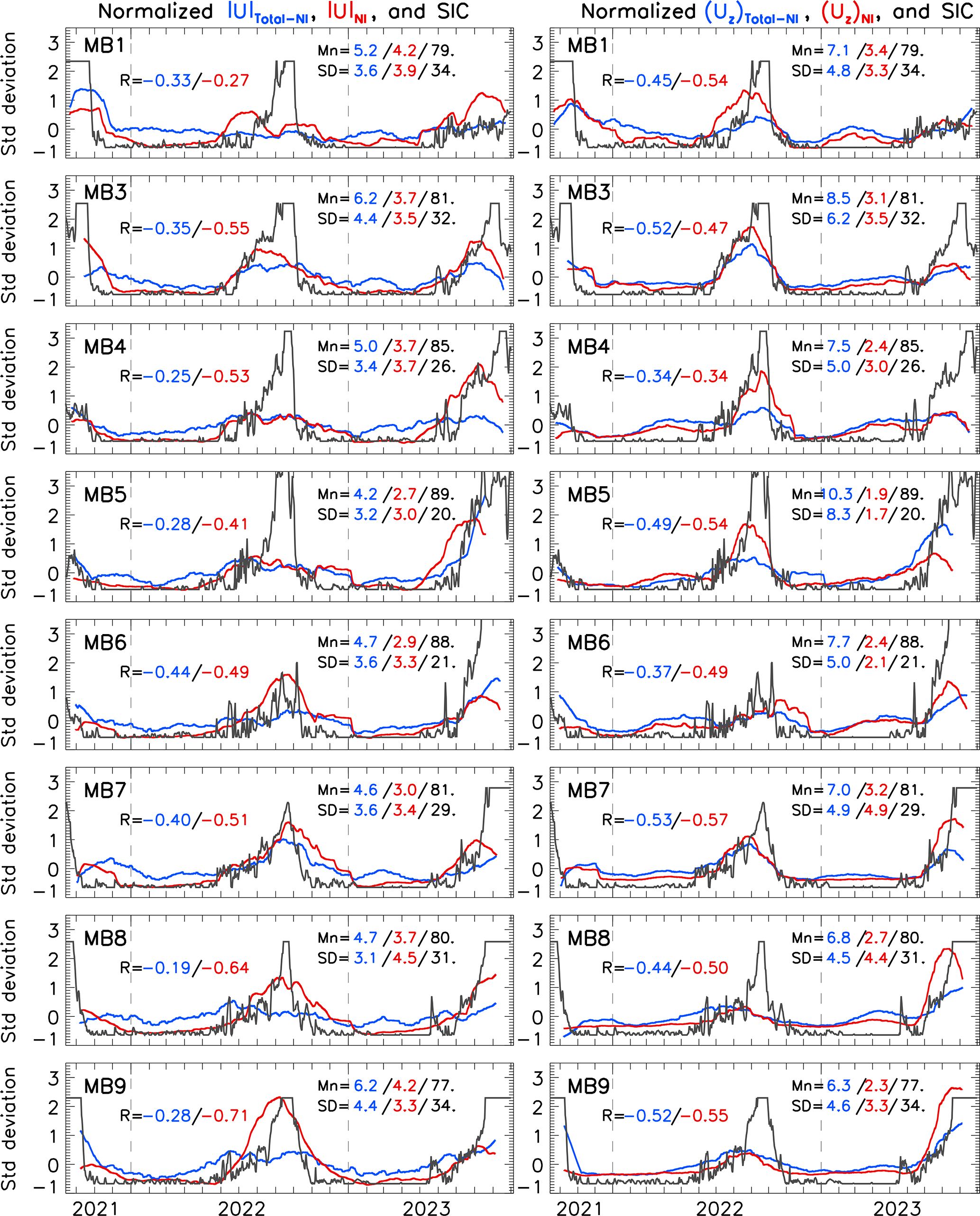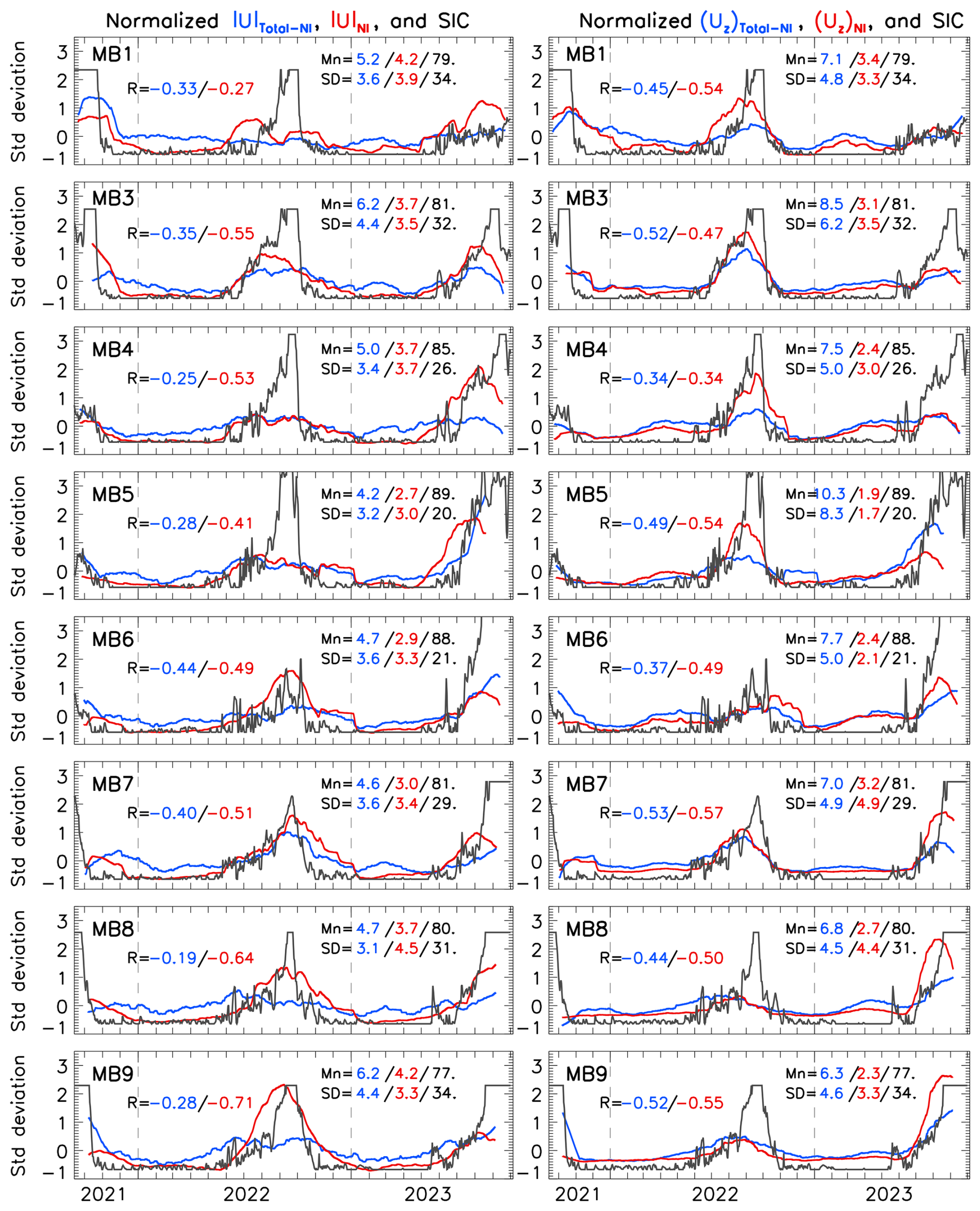 Figure 5Time series of normalized (reduced to anomalies by subtracting means, Mn, and divided by standard deviations, SD) current speed , vertical shear of horizontal current Uz (both from 10 m depth level), and sea ice concentration (SIC, the latter time series are multiplied by minus one) at eight mooring locations. Blue lines show parameters for total minus near-inertial currents, red lines show parameters for near-inertial currents, and gray lines show SIC. Mn and SD are provided for in cm s−1, Uz in 103 s−1 and SIC in %. Due to the large number of observations used in the analyses, the correlations R between and SIC (blue digits) and Uz and SIC (red digits) are all statistically significant at the 0.05 % level. This was determined using a standard Student's t-test, which assesses whether the observed correlation coefficients differ significantly from zero, accounting for sample size and assuming normally distributed data. The effective number of degrees of freedom is computed following the Chelton's (1983) modified method which takes into account autocorrelations.