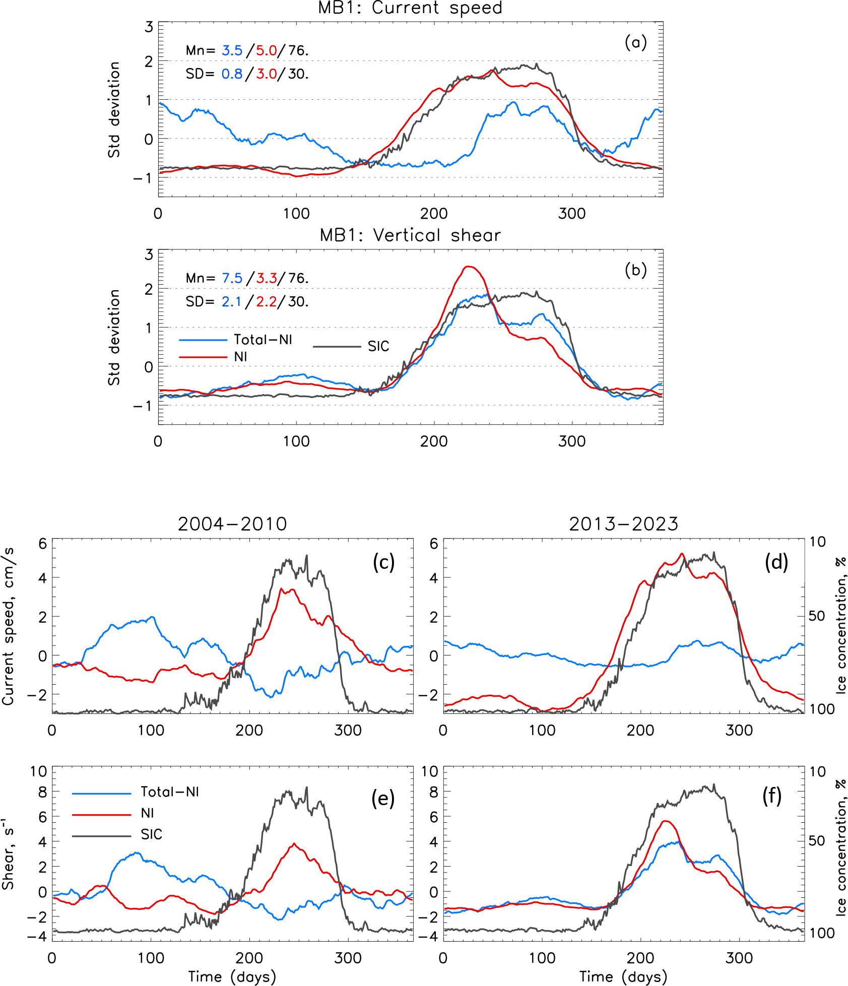 Figure 6(a, b) Mean 2013–2023 seasonal cycle of current speed (, cm s−1, blue), vertical shear of horizontal current (Uz, 103 s−1, red), and sea ice concentration (SIC, %, grey, multiplied by minus one) reduced to anomalies by subtracting means (Mn) and normalized by standard deviations (SD). (c–f) Mean 2004–2010 and 2013–2023 seasonal cycles of current speed (, cm s−1, blue), vertical shear of horizontal current (Uz, 103 s−1, red), and SIC (%, grey). 10 m depth at MB1 mooring location (eastern Eurasian Basin). Monthly running mean smoothing is applied to all time series.