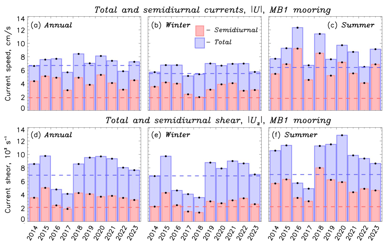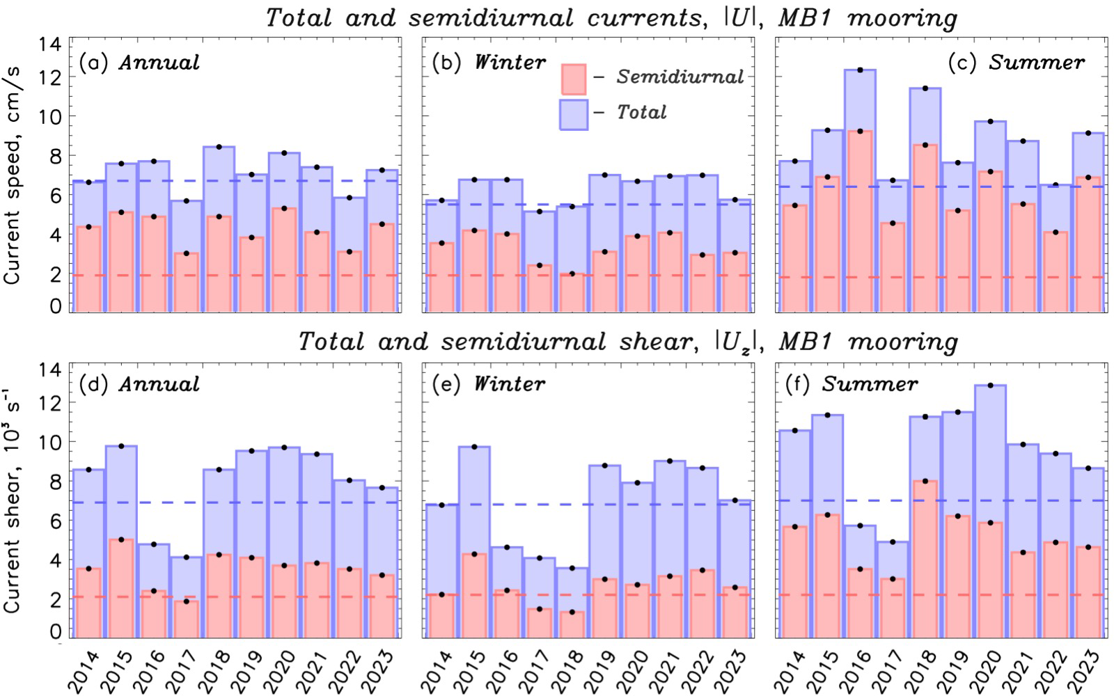 Figure 8Temporal changes in total (blue) and semidiurnal-band (near-inertial, red) currents and their shear from 2014 to 2023 in the upper 30 m. Estimates of (a, d) annual (January–December), (b, e) winter (November–July), and (c, f) summer (August–October) for mean current speed and vertical shear of horizontal currents respectively, at MB1 mooring location. Dashed blue and red horizontal lines indicate 2004–2009 means. Statistical significance of means (error bars) is shown at the 95 % confidence level.