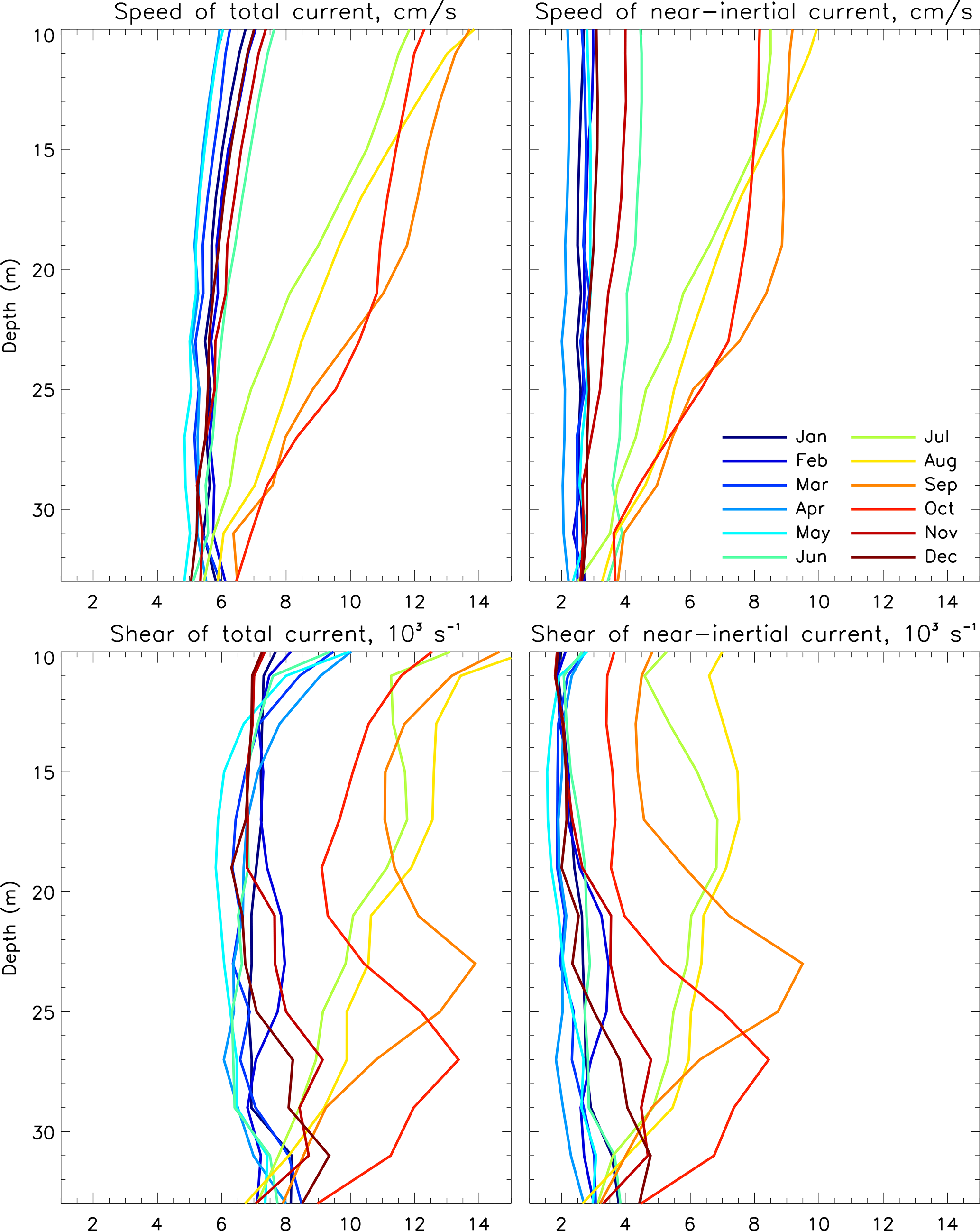 Figure 9Monthly mean 2004–2023 vertical profiles of (top) current speed and (bottom) vertical shear of horizontal currents. Total current speed and shear are shown in the left column, while semidiurnal (near-inertial) current speed and shear are shown in the right. All data are from the MB1 eastern Eurasian Basin mooring.