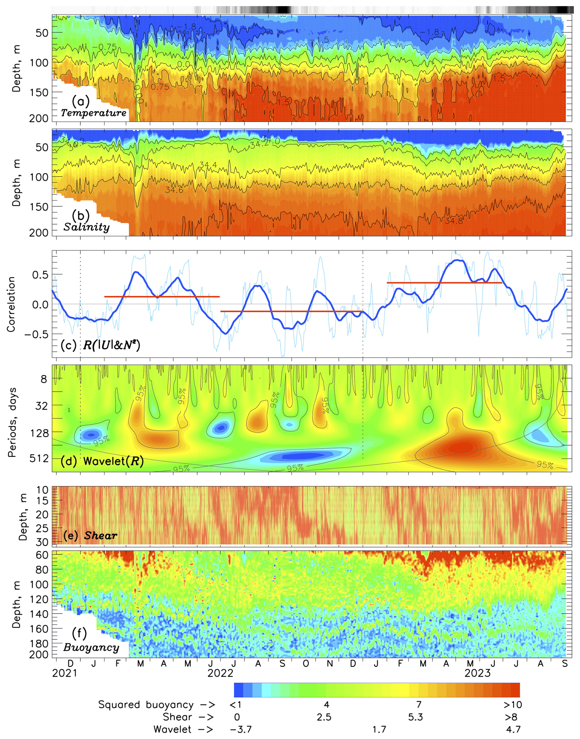 Figure 11(a) Potential temperature (°C), (b) salinity, (c) running correlation (R) between current speed () and squared buoyancy frequency (N2) at 100 m depth using a 30 d running window (dashed lines: daily values; solid lines: smoothed using monthly window; statistically significant values at the 95 % level are when , horizontal red segments show seasonal means), (d) wavelet transform of the R time series (95 % significance and cones of influence indicated by grey lines), (e) vertical shear of horizontal currents (s−1), and (f) squared buoyancy frequency (10−5 s−2) in the eastern Eurasian Basin (MB1 mooring location) during 2021–2023. The black–gray–white bar above the top panel shows daily sea ice concentration, ranging from 0 % (black) to 100 % (white) on a linear color scale. White segments indicate missing data.