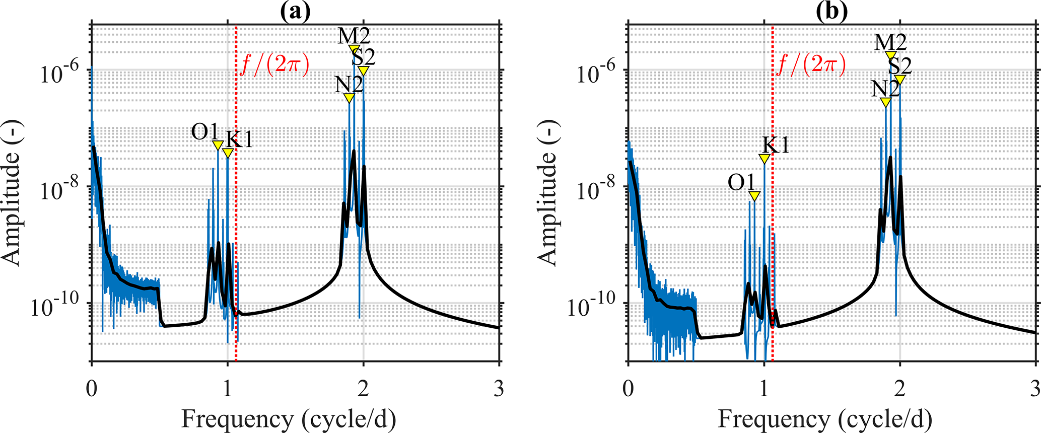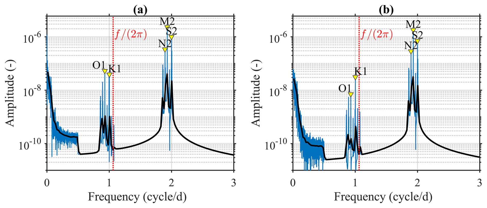 Figure 10Spectrum amplitude of the reconstructed sea surface height gradients: (a) and (b) . Blue lines indicate raw spectra and black bold lines represent band-averaged spectra using a 100-point window. Major tidal constituents (O1, K1, M2, S2, and N2) are marked with yellow triangles, and the vertical red dashed line indicates the local Coriolis frequency (). These spectra show limitation of the simple sea surface height reconstruction that resolves only low frequency signals from altimetry and several high frequency modes from tides. Many intermediate and higher frequency signals are not resolved.