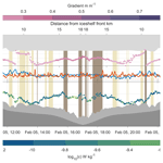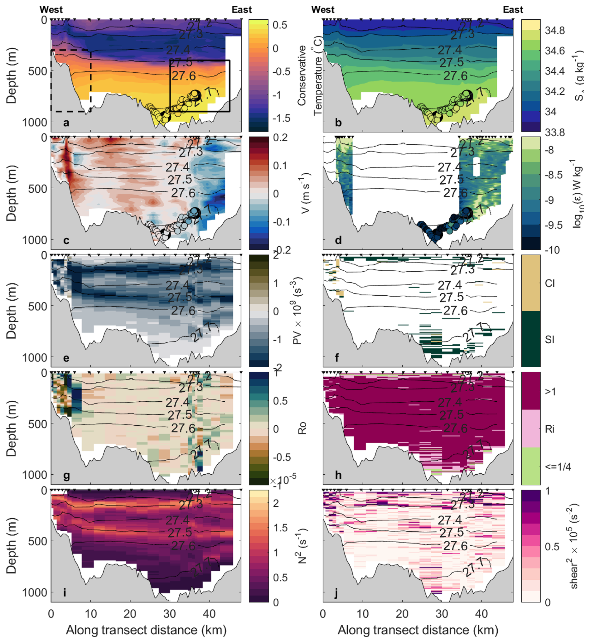 is the buoyancy, g is the gravitational acceleration, f is the planetary vorticity, ρ is the in situ density, and 1028 kg m−3 is the reference density. When calculating q for the ALR data, we used the vertical distance between the good-quality bin closest to the ALR in the upward and downward looking ADCP data as Δz (approximately 38 m), and the horizontal distance between successive two-minute medians of each bin (approximately 72 m) as Δx. The along-slope velocity component from these bins is v. For the section at the DIS front, we used the horizontal distance between neighbouring CTD casts as Δx, the vertical resolution of the LADCP (8 m) as Δz, and the meridional component of the current velocity as v. We then calculated the Rossby number, Ro