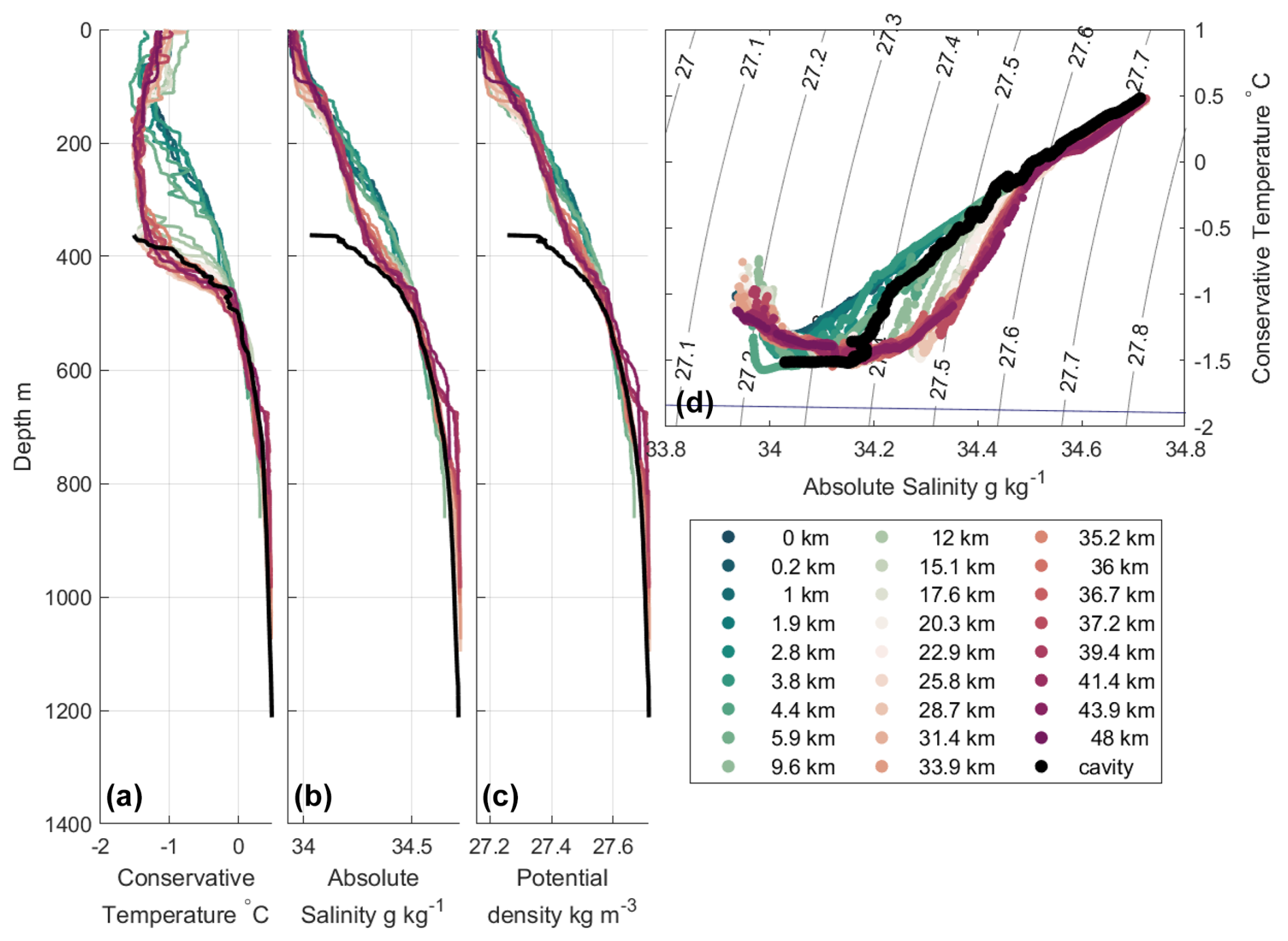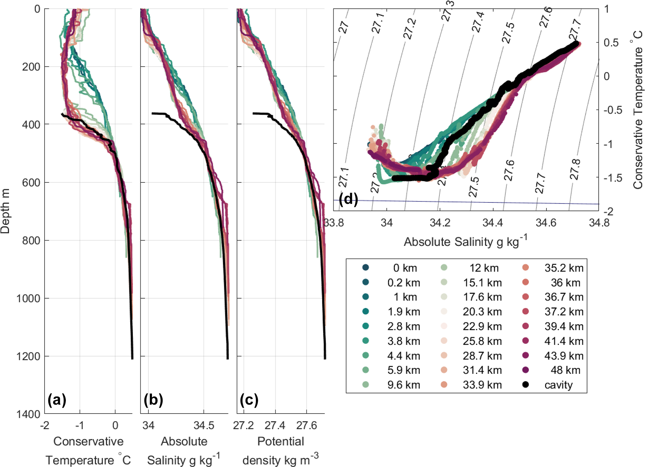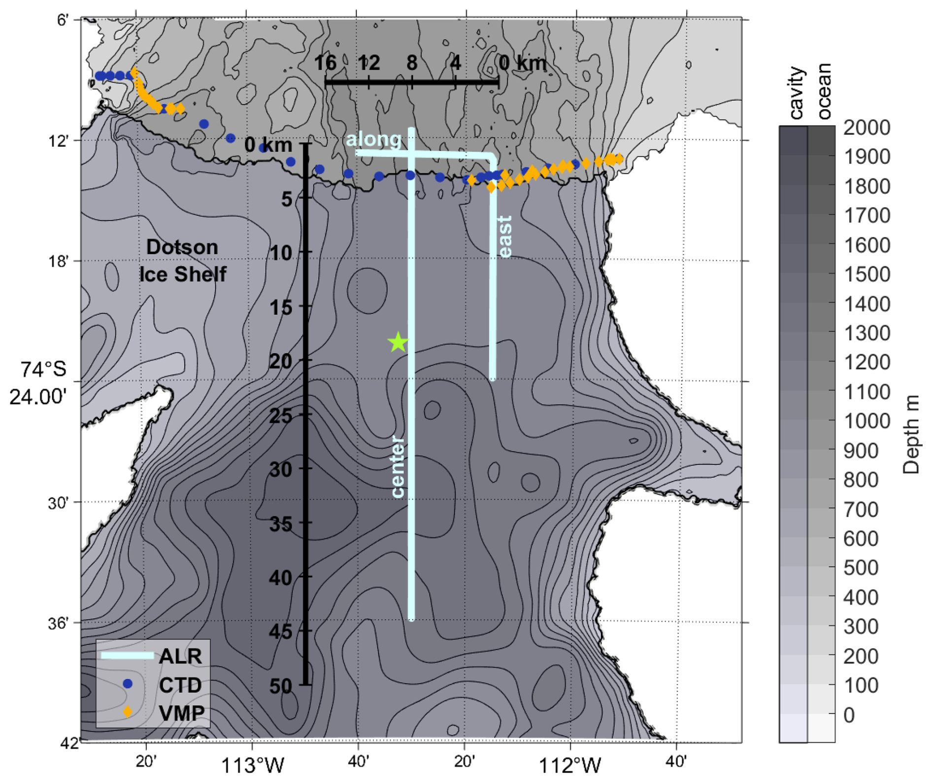 In 2022 DIS was surveyed with Conductivity, Temperature, Depth profilers (CTD), Lowered Acoustic Doppler Current Profilers (LADCP) and Vertical Microstructure Profilers (VMP) at the ice front and several dive tracks into the ice shelf cavity using an AutoSub Long Range (ALR) underwater vehicle (Fig. 2). The ALR travelled along the bottom of the cavity, keeping a distance of 100 m from the seabed.