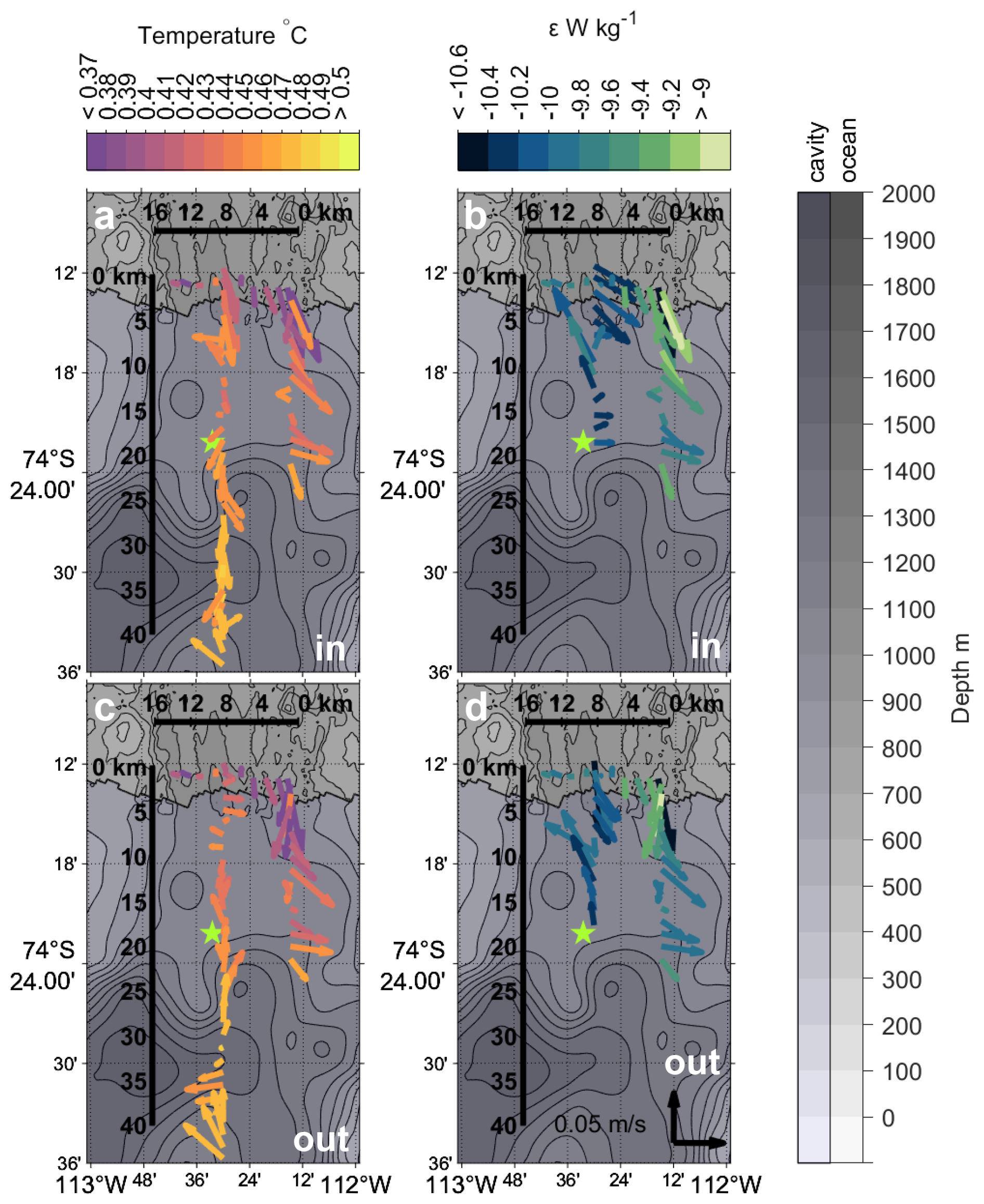 Figure 5ALR dive tracks in front of and beneath Dotson Ice Shelf. 40 min median depth averaged (median) currents along the dive tracks during the way into the cavity (a, b) and out of the cavity (c, d) coloured by conservative temperature (a, c) and turbulent kinetic energy dissipation rate (b, d). Star marks the location of a CTD profile obtained through a hole melted through the ice shelf into the cavity. Bathymetry as for Fig. 2.