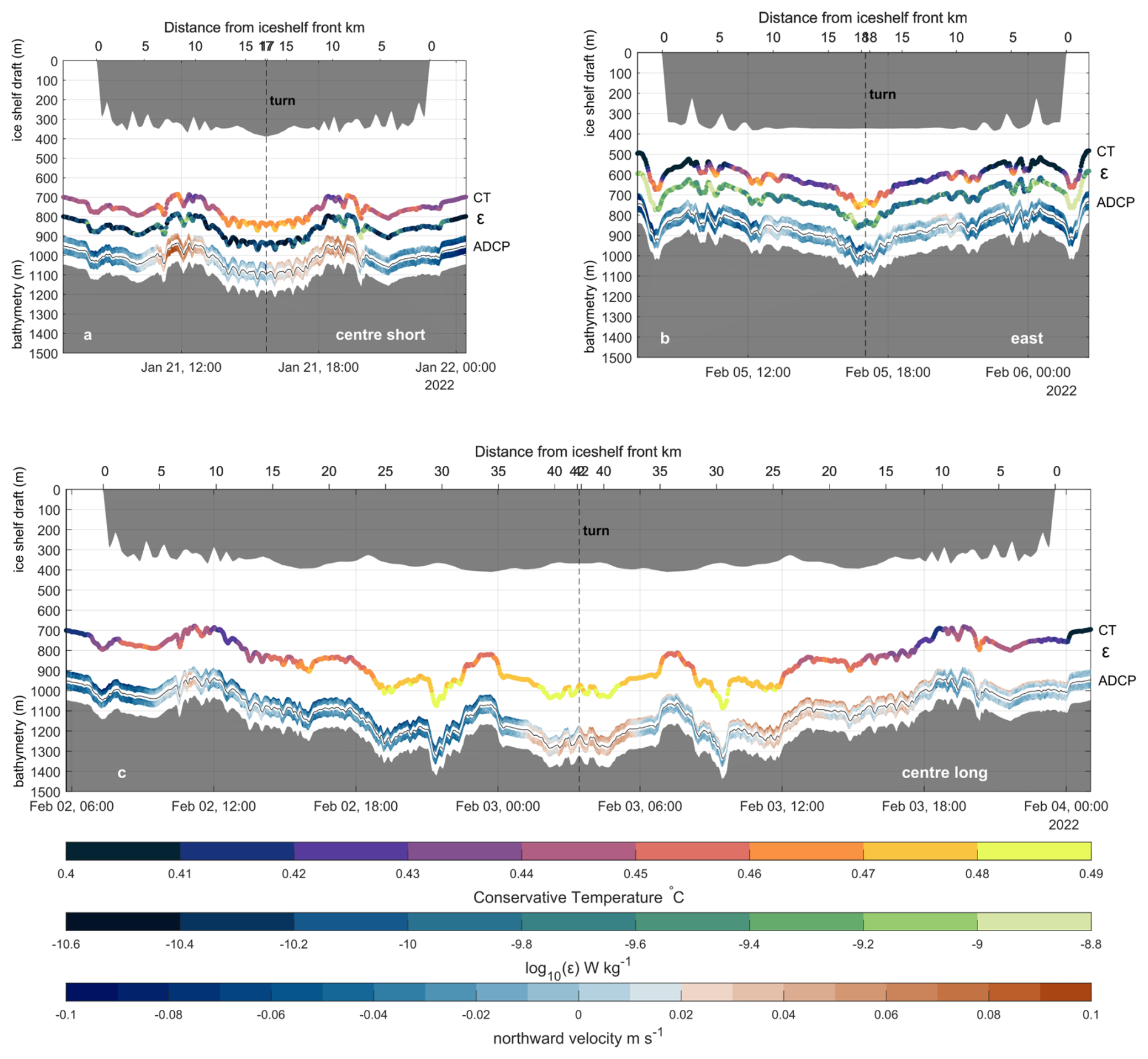 Figure 6ALR dive tracks into Dotson ice shelf cavity for the centre_short (a), east (b) and centre_long (c) missions. The depth at which the ALR was flying is shown in the thin black line; the northward ADCP current velocity is shown above and below this line. We also show turbulent kinetic energy dissipation rate (ε) and Conservative Temperature (CT) measured by ALR, but offset vertically here for clarity. No turbulent kinetic energy dissipation values are available for the centre_long mission. The small labels to the right of the coloured lines indicate the variable measured, and corresponding colour bars are below panel c. The bathymetry is as measured by the ALR, and the depth of the iceshelf base is from Bedmachine V3 (Morlighem, 2022). Vertical dashed lines indicate where the ALR turned back.