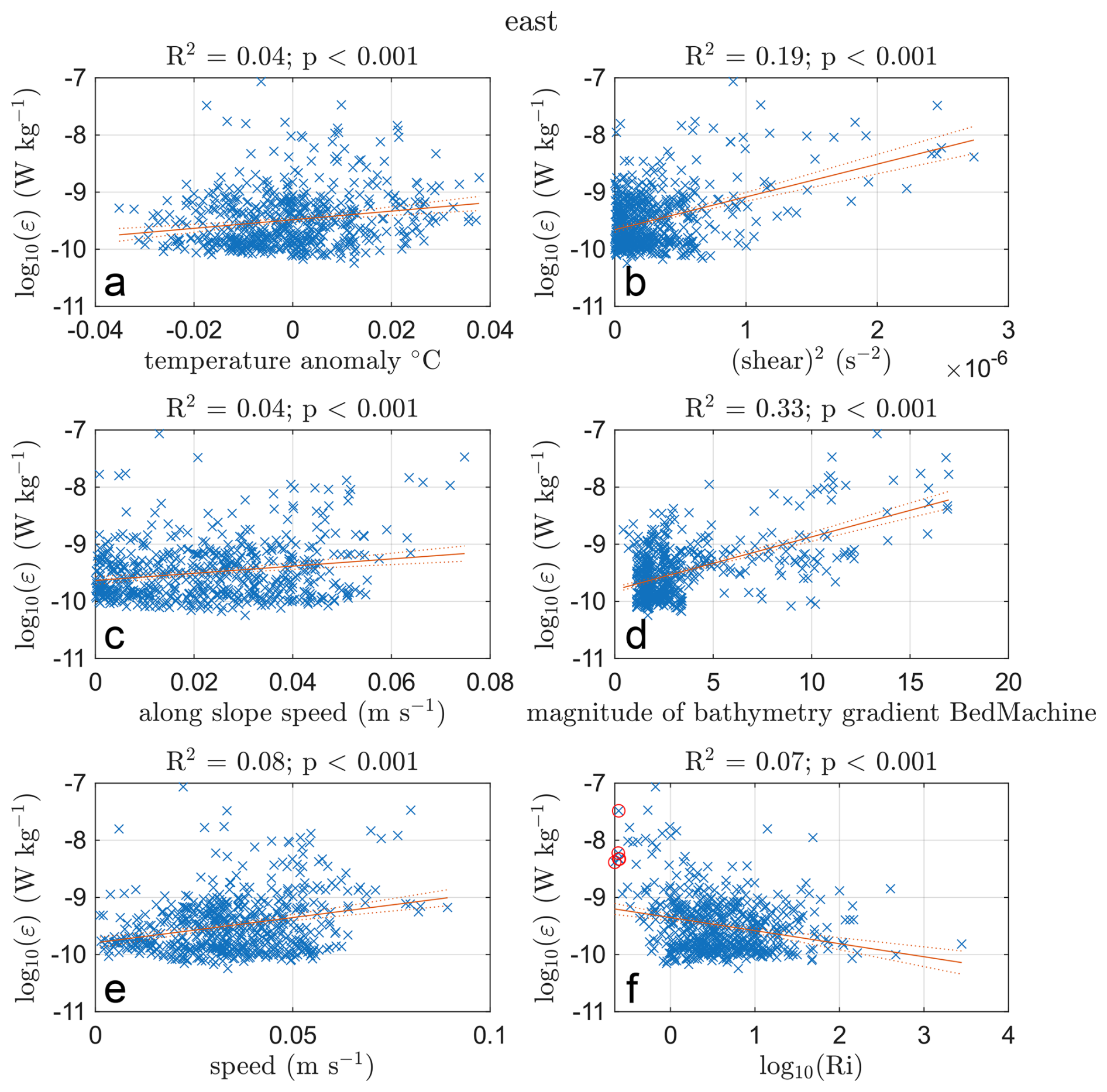 Figure 7Turbulent kinetic energy dissipation rate plotted against drivers (blue crosses) with linear fit (solid red line) and 95 % confidence bounds for the fit (dotted red line). (f) Red circles mark where Ri<0.25. R2 is the percentage variance explained by the driver, p is the f-test percentage likelihood that the slope of the fit is zero.