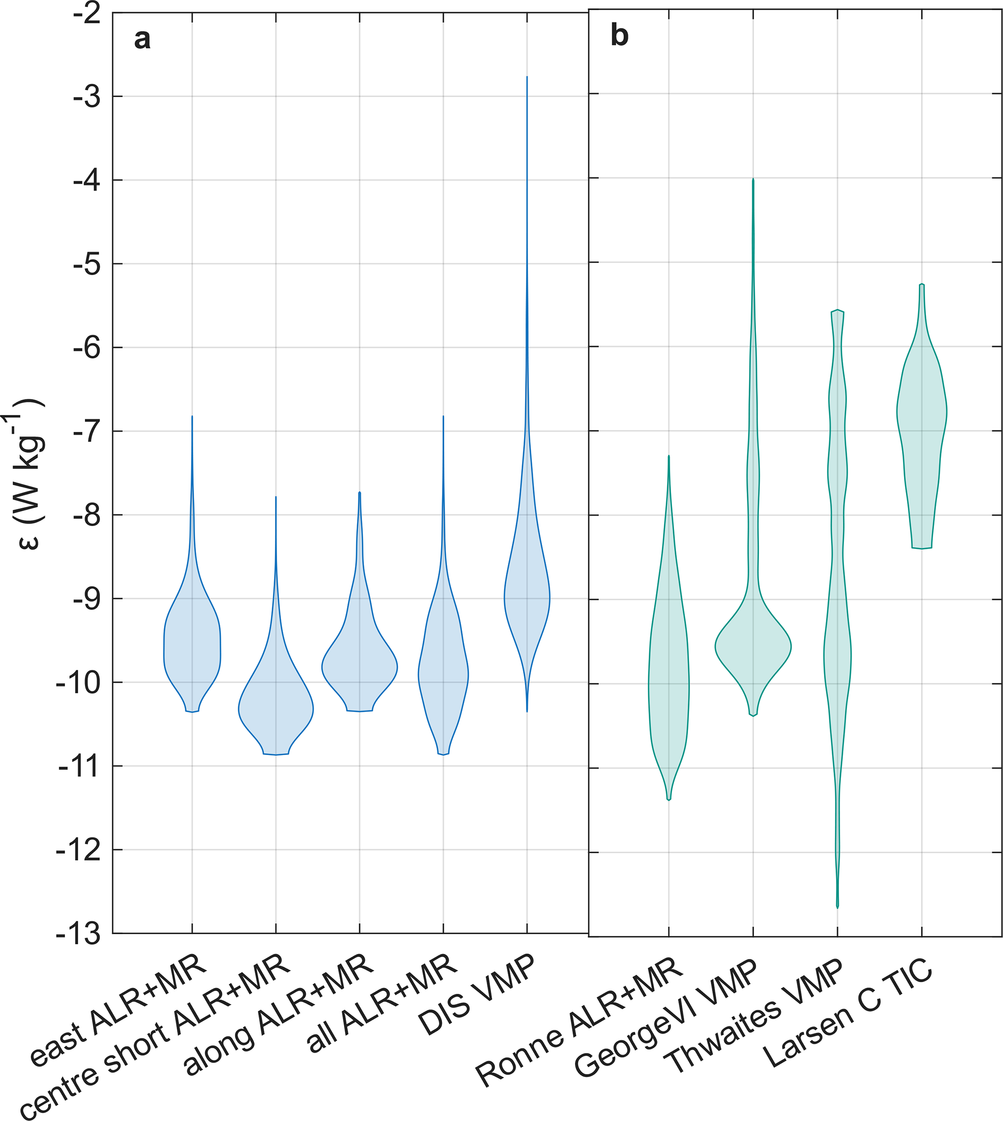 During our observations, the DIS front is characterized by relatively warm and fresh surface waters in the upper 100 m, a layer of colder Winter Water (WW) at 100–400 m, and warmer, saltier mCDW below that (Fig. 3a). Below the WW temperature minimum, the water column is salt-stratified with fresher colder water overlying warm salty water. The temperature and salinity at the ice front are within the historic range of watermass distributions and properties at DIS (Kim et al., 2021). The ice shelf draft is approximately 300 m at the front, meaning that typically only mCDW can enter the cavity. A bottom intensified southward current flows into the cavity in the east, between the 400 and 900 m isobaths, and a shallower, bottom intensified northward current flows out of the cavity in the west (Fig. 3c). The outflow region is not the focus of this paper and is discussed in detail by Dotto et al. (2025). The ALR measurements just skim the western edge of the inflow. Below 500 m depth, turbulent kinetic energy dissipation is elevated in the inflow (compared with other areas below 500 m along the ice front). Turbulent kinetic energy dissipation is in the inflow over an area approximately 7 km wide and 200 m high (Fig. 3d; turbulent kinetic energy dissipation rate is elevated between 38 and 45 km of the ice front and ∼200 m above the seabed). The centre of the ice front did not have VMP measurements, however, the ALR and the VMP measurements farthest from the lateral walls suggest that turbulence is low here. In the area where we have both VMP and ALR measurements of turbulent kinetic energy dissipation rate, both instruments record values of the same order of magnitude. This means that the ALR measurements under DIS can be interpreted with confidence as comparable in quality to the VMP measurements.
