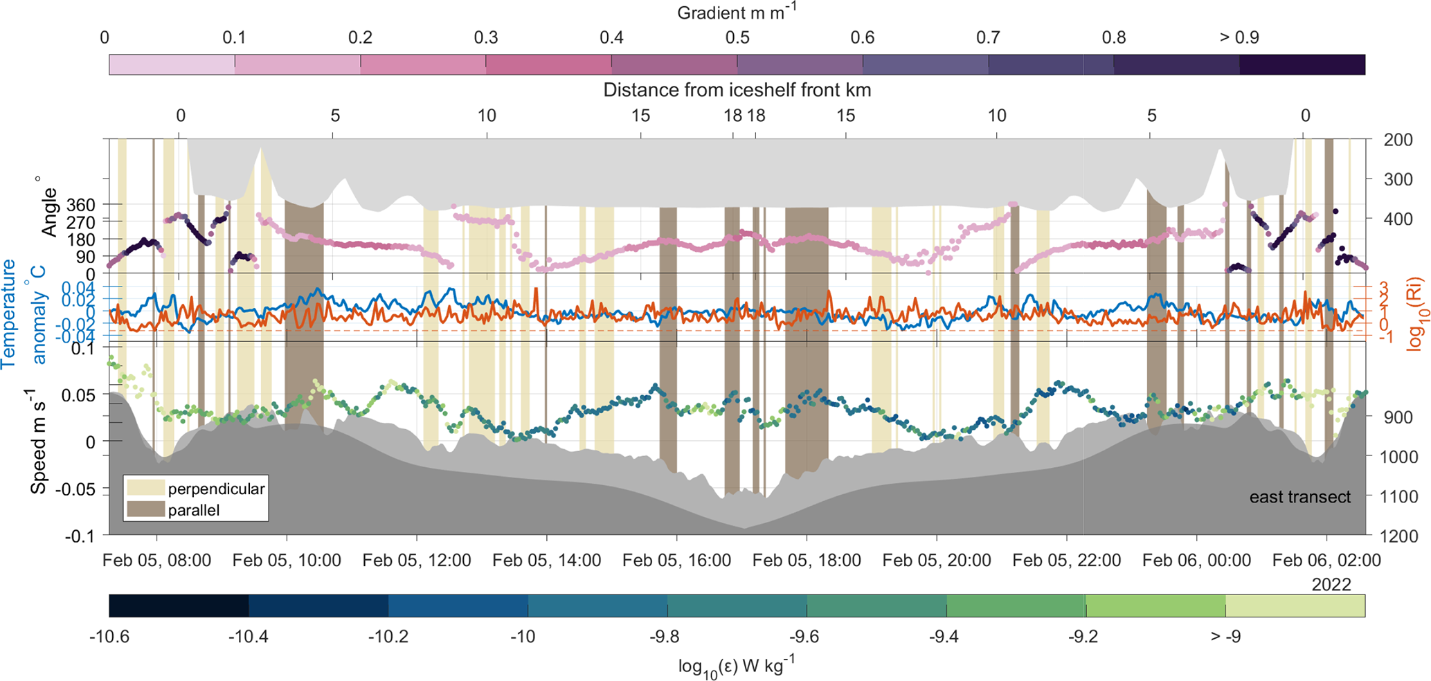 Figure 9Timeseries of the east dive track into the Dotson Ice Shelf cavity. Top panel shows the angle at which the current direction intersects with the maximum bathymetric gradient (an angle of 0° is flow parallel to the isobaths with high ground to the right of the flow; an angle of 90° is downhill flow). Middle panel shows temperature anomaly (relative to the depth mean) and current shear. Bottom panel shows current speed coloured by turbulent kinetic energy dissipation rate, ε. Bathymetry measured by ALR is shown in light grey, and the smoothed bathymetry used to calculate the bathymetric gradient is shown in dark grey. Beige patches show where the current is perpendicular to the isobaths, and brown patches show where the current is parallel to the isobaths. The distance travelled by the ALR relative to the start of the dive track is shown on the top panel, time is shown on the bottom panel.