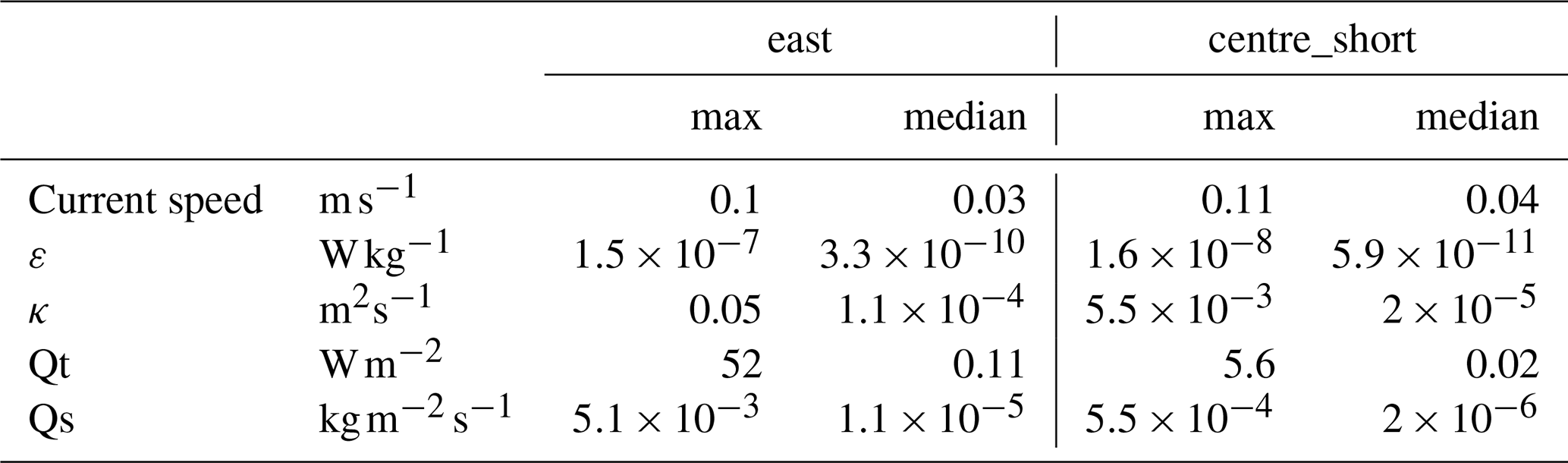 Table 2Maximum and median values for key quantities along the east and centre_short dive tracks into the Dotson ice shelf cavity. Values are calculated from observations at their highest resolution (1 s for current speed, 32 s for all other variables), without prior smoothing or binning.
