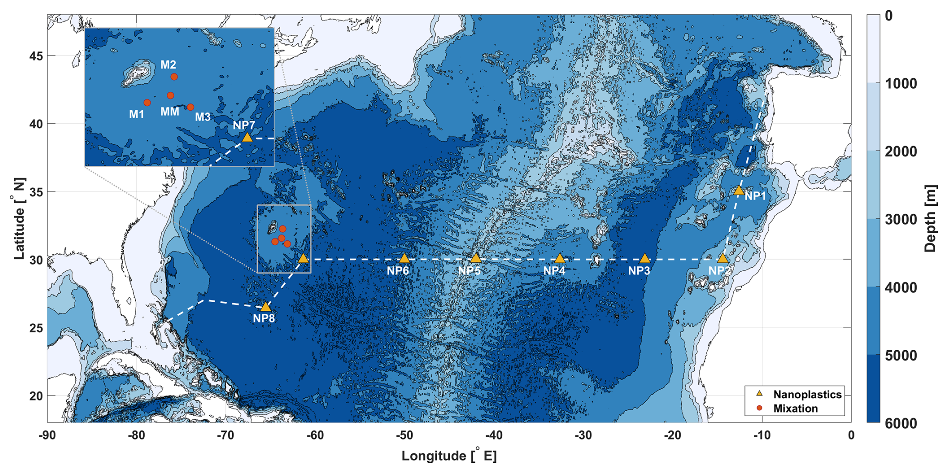 In this study we use a set of microstructure profiles collected during the Mixation and Nanoplastics 2 cruises (Fig. 1). A total of 12 full-depth microstructure profiles (VMP-6000, Rockland Scientific International Inc) with standard (pumped) CTD data (SeaBird Electronics SBE 3/4/5, 64 Hz) were collected to approximately 30 m above the seafloor. Except st. NP3, where the VMP experienced an early release approximately 700 m above the seafloor. Additional minor problems with the FP07 thermistors were encountered at some stations, such as anomalous spikes likely caused by collisions or general malfunctioning of one of the probes. These problems were taken care of in the post-processing and at any time, at least one of the probes was functioning as intended. The stations of the Mixation cruise are referred to as M1, M2, M3 and MM. The stations of the Nanoplastics cruise will be called NP1–NP8. An extensive description of all used methods is provided in the appendices.