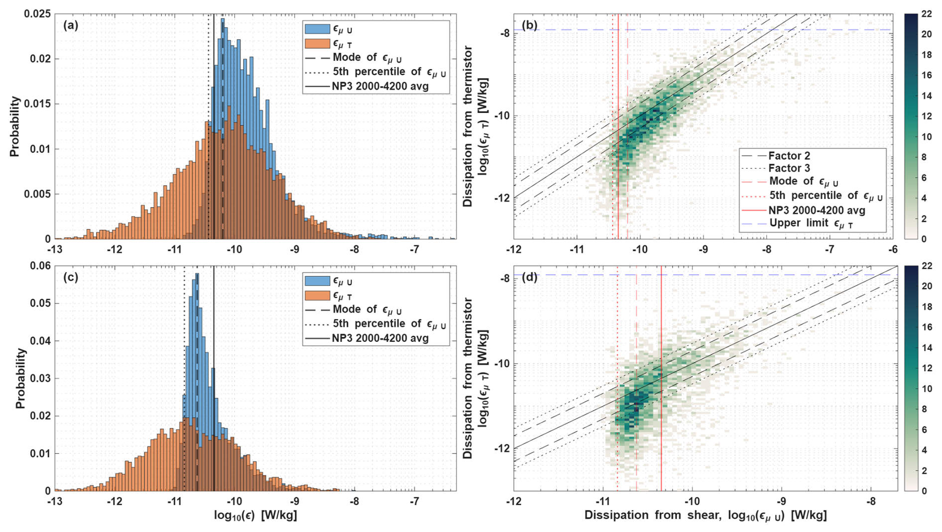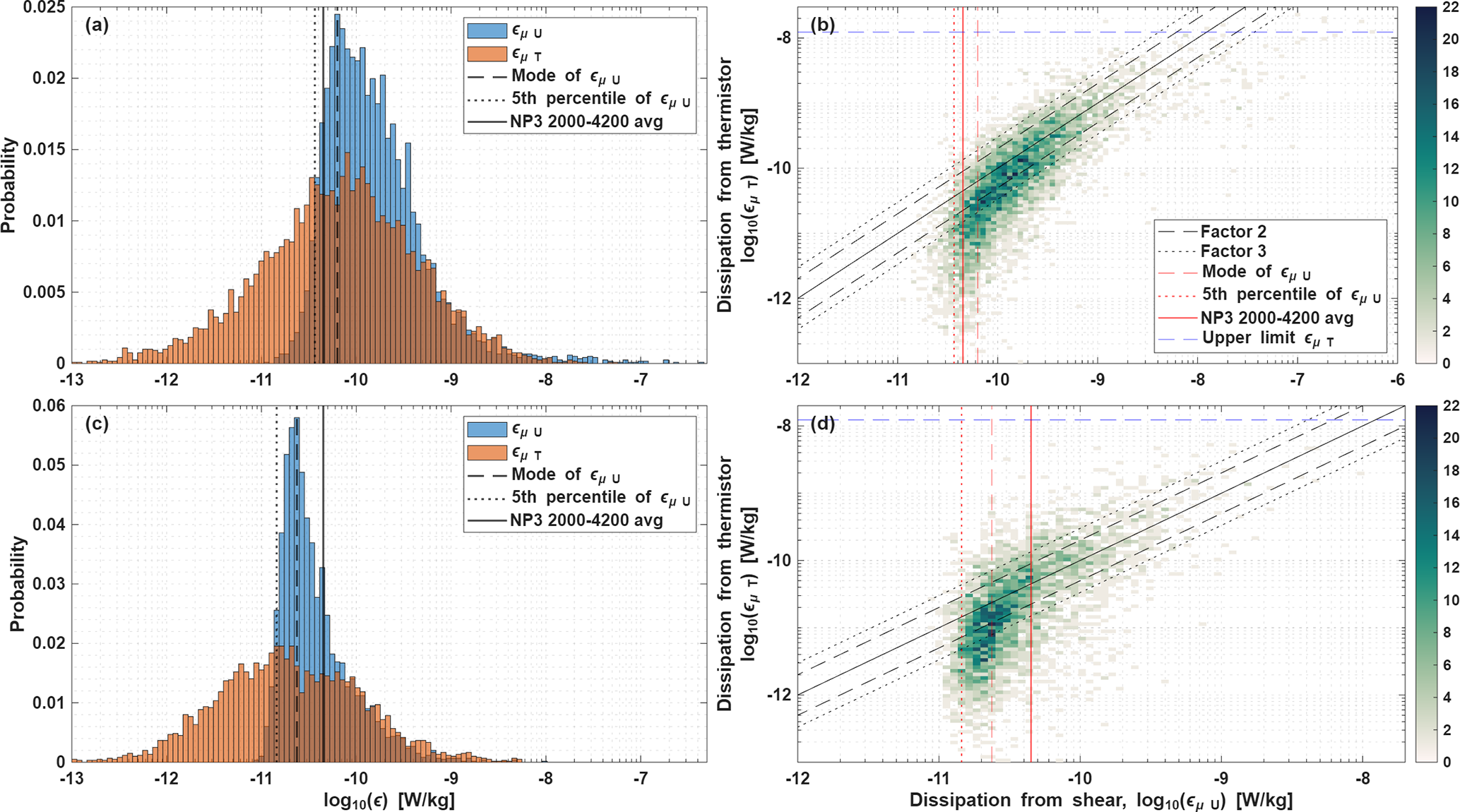 We now explore various methods for defining the noise floor of shear-derived εµU for each dataset. Scheifele et al. (2018) suggests using the mode of εµU as an indicator for the noise floor, whereas Piccolroaz et al. (2021) suggests taking the lower 5th percentile. The noise floors derived from these methods for both cruise datasets are summarized in Table 1 and marked in Fig. 3b, d. However, because of the large difference between the estimates of dissipation rates from the fast-response thermistor and the shear probes for station NP3 (below 2000 m, Fig. 2), we have a unique opportunity to provide another estimate of the noise floor for shear probes. The open-ocean turbulent dissipation rates are so low in this region, that the estimates of dissipation by the shear probe are about an order of magnitude larger than the dissipation rates measured by the thermistors, and are therefore reflective of the noise in the instrument. We can thus estimate the noise floor empirically by taking the average and standard deviation over part of such noise-dominated region, where the disagreement between the εµU and εµT is largest and consistent (i.e. st. NP3 between 2000–4200 dbar). The (arithmetic) mean over this section is W kg−1. Table 1 shows that the empirical estimate is close to the methods used by Scheifele et al. (2018) and Piccolroaz et al. (2021), ranging 1.4– W kg−1. It is noted that the Nanoplastics stations have higher noise levels than the Mixation dataset, even though the same instrument was used and that this empirical noise estimate is rather conservative for the Mixation cruise, given the solid red line in Fig. 3d. However, the noise floor of a sensor is not a hard threshold, it represents the range where the signal is dominated by an increasing amount of noise. Instead, to be sure the signal contains very little noise, we suggest to set the threshold for discarding shear-based dissipation rates at the mean plus two standard deviations, which equals W kg−1. When also accounting for other environmental and instrument-specific factors influencing uncertainties mentioned above, a value of W kg−1, as often found in literature, would equal the mean plus 3 standard deviations and would put a user absolutely at the save side of knowing the results are not dominated by noise.