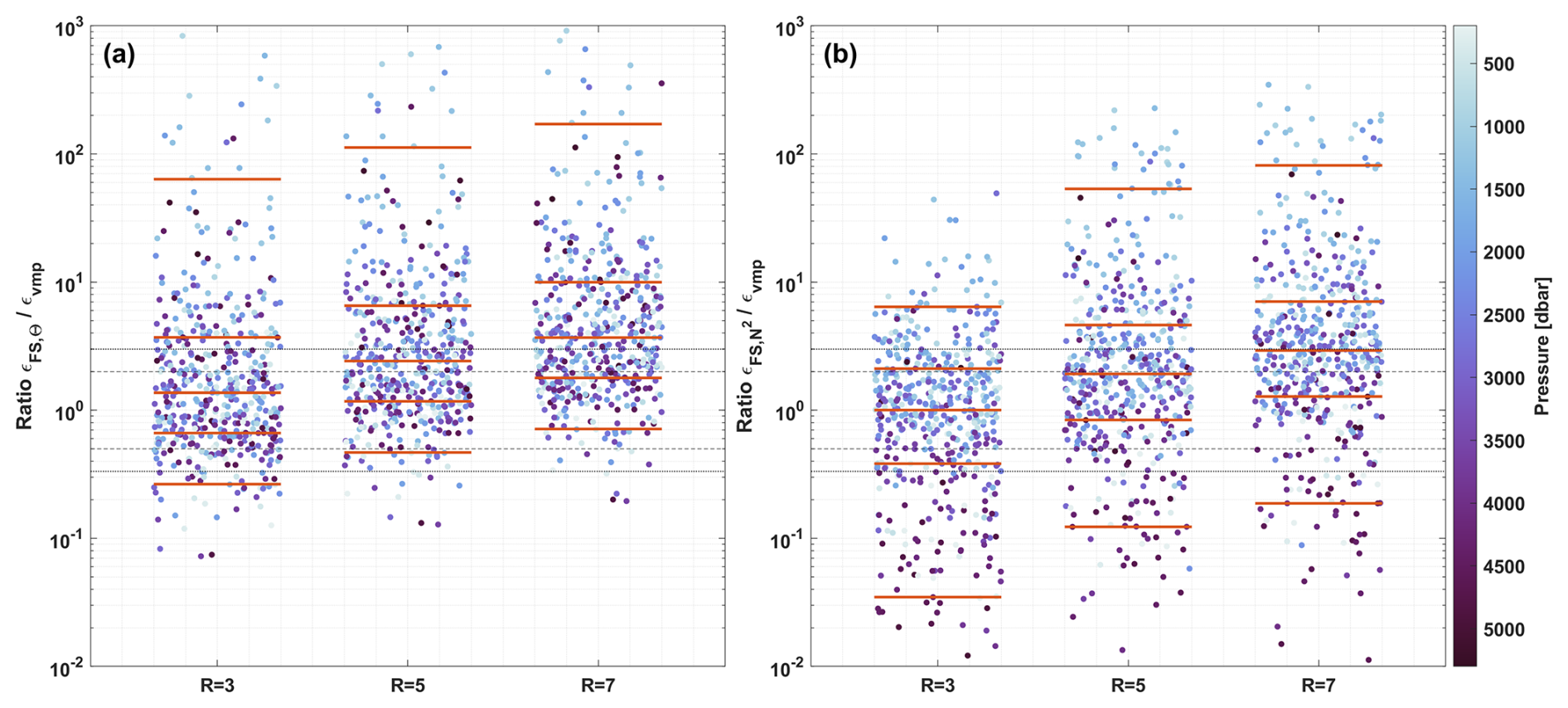 Figure 4The ratios between εFS and εvmp, for different values of Rω. With (a) strain based on Θz and (b) strain based on N2. εvmp has been averaged over the same segments as the segments of the finescale method. Color coding of the dots indicates average pressure of finescale estimate. The black lines indicate a factor 2 (dashed) and 3 (dotted) respectively, and the orange lines mark, from bottom to top, the 5, 25, 50, 75 and 95th percentiles. Jitter of the dots is to increase readability.