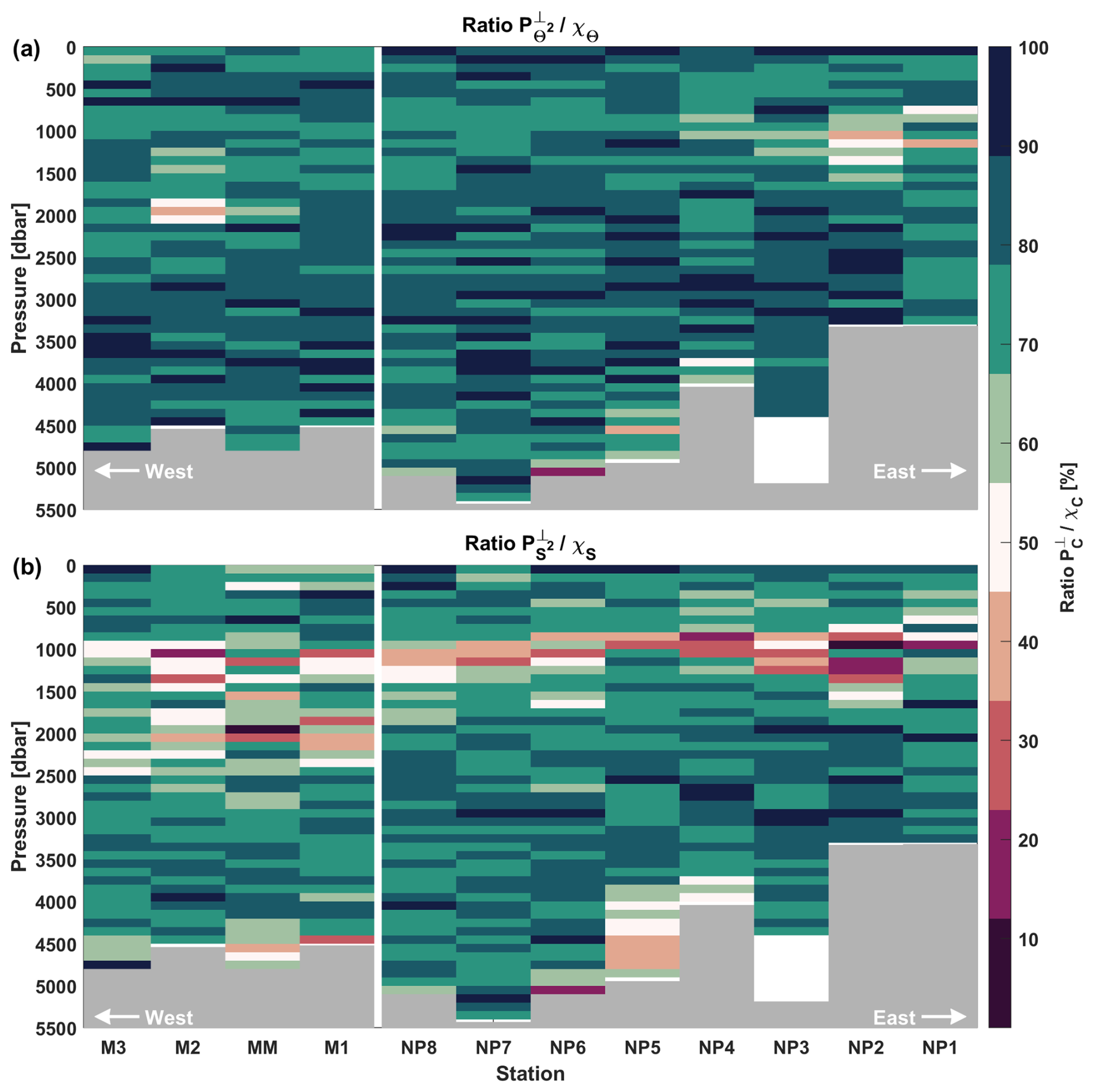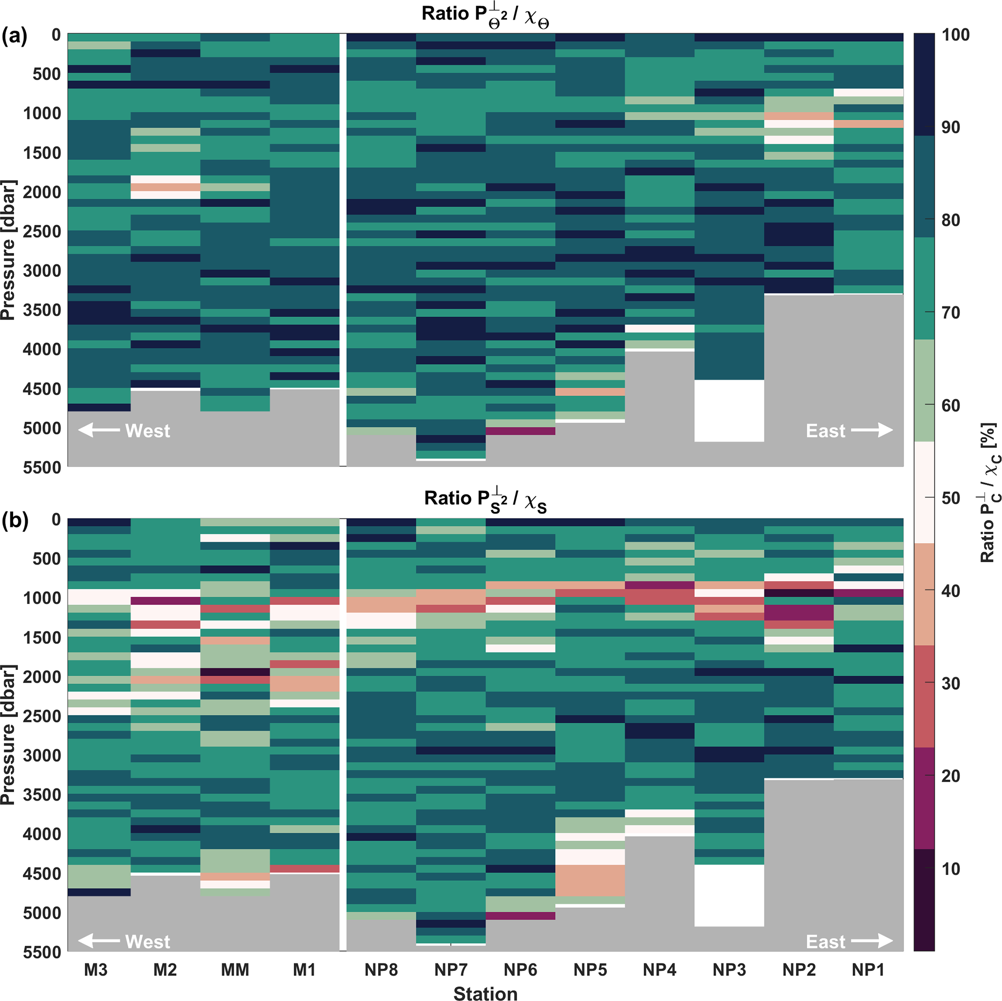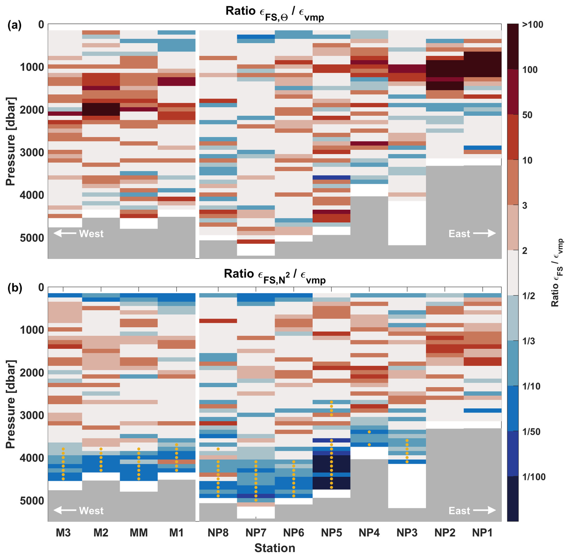 In Fig. 5, the ratio is plotted per station. Here the upper 100 dbar is omitted, as well as the two bins closest to the bottom, due to boundary effects (note, the surface mixed layer was shallower than 100 dbar for all profiles). Note that station NP5 is located within a fracture zone canyon with an observed bottom boundary layer from 3800 dbar and deeper, such that processes other than internal wave breaking may dominate the dissipation (Kunze et al., 2002; Polzin et al., 2014), and results should be treated with caution.