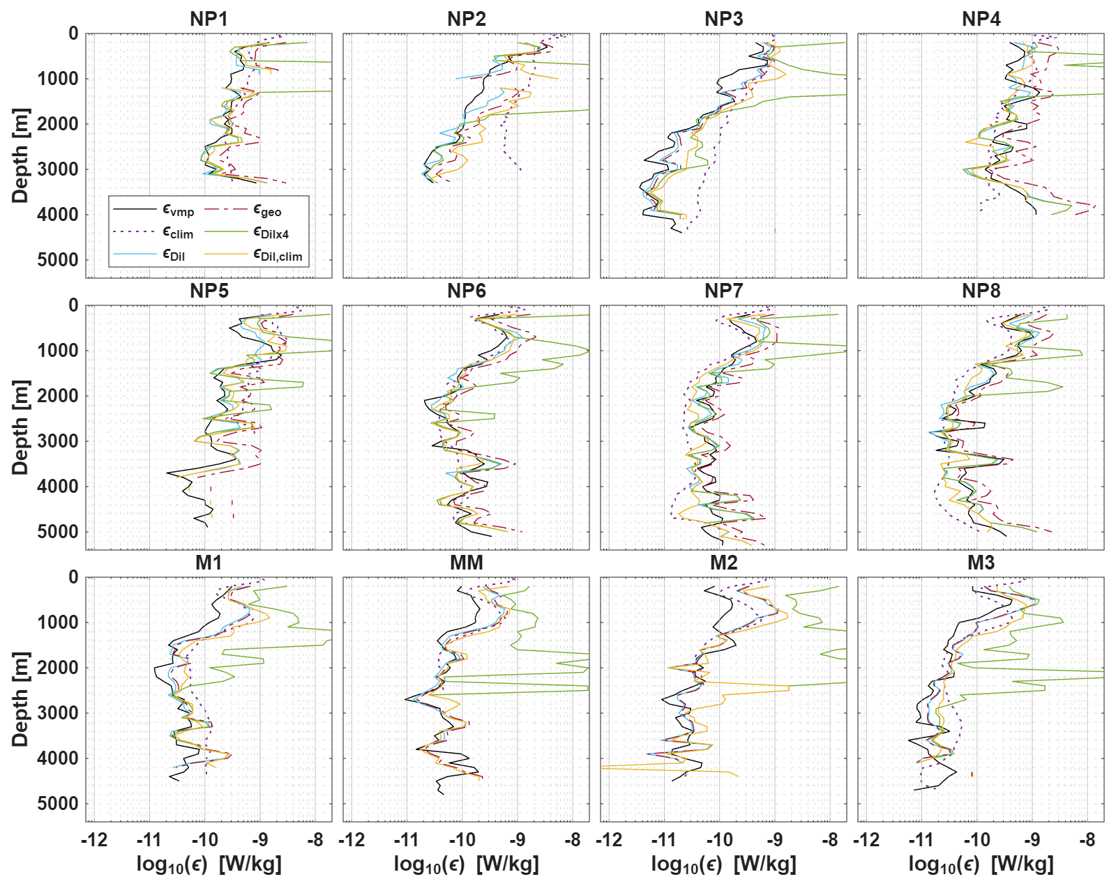 Method 4 uses climatological dissipation rates εclim (de Lavergne et al., 2019, 2020) for calculating LO and Criterion 4. Generally εclim slightly overestimates the measured dissipation rates εvmp (Figs. 6 and C2), but overall follows the broad structure of εvmp over multiple orders of magnitude. The climatological estimates do in some occasions show larger differences, e.g. differences in depth (e.g. st. NP5 and MM) or have a larger overestimate (e.g. st. NP2 and NP3).