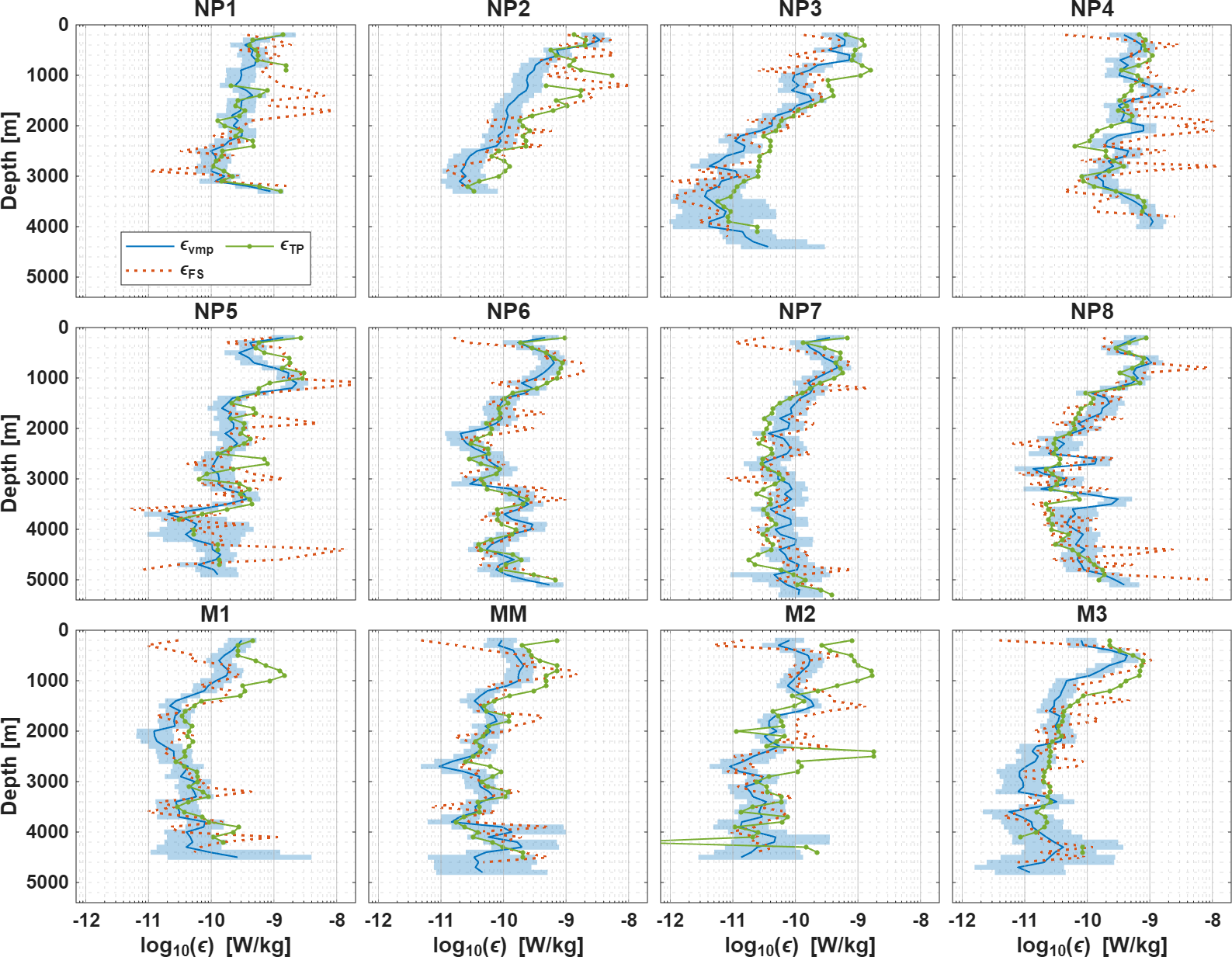 Figure 2Dissipation rates obtained from the microstructure shear probes (in blue) and the microstructure thermistor probes (in red) for each station. The background shading marks the 95 % confidence interval. A 5-point running mean has been applied to increase readability.
