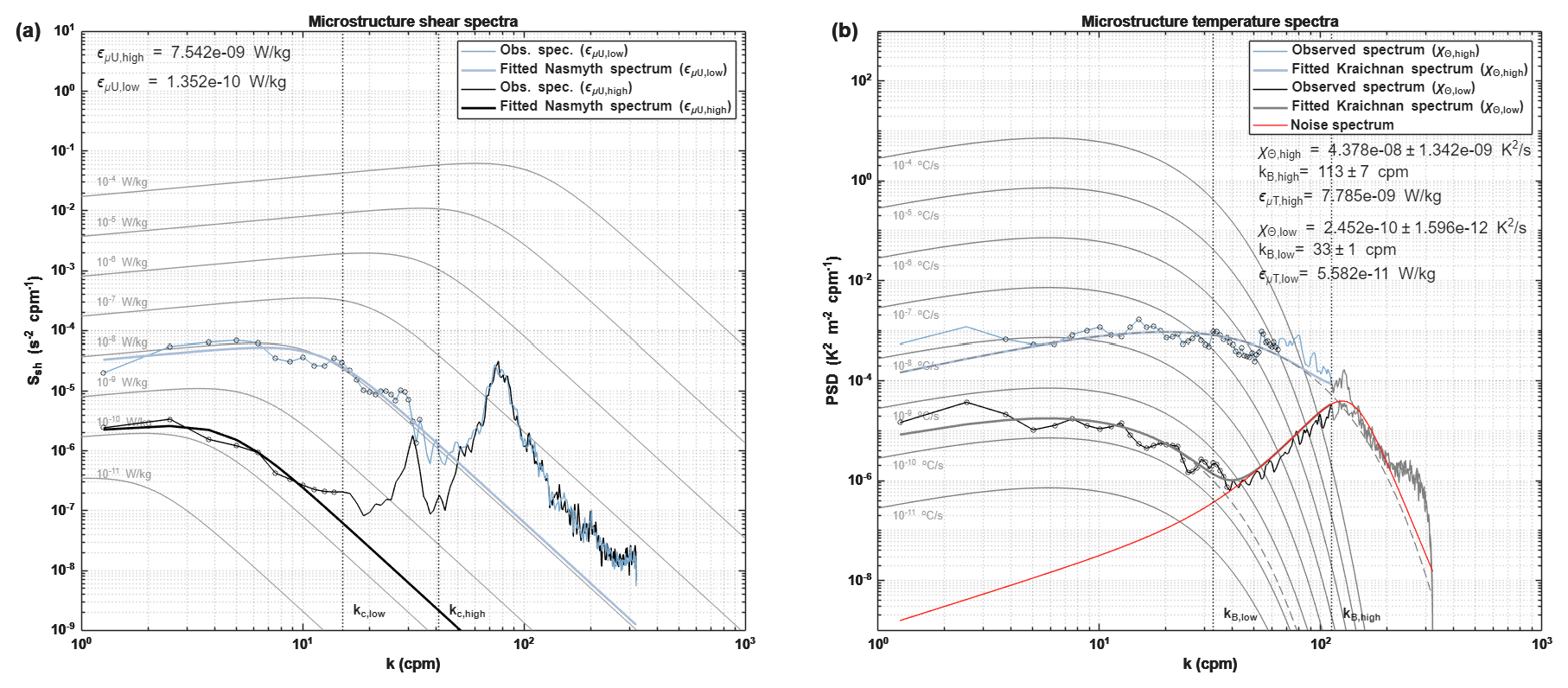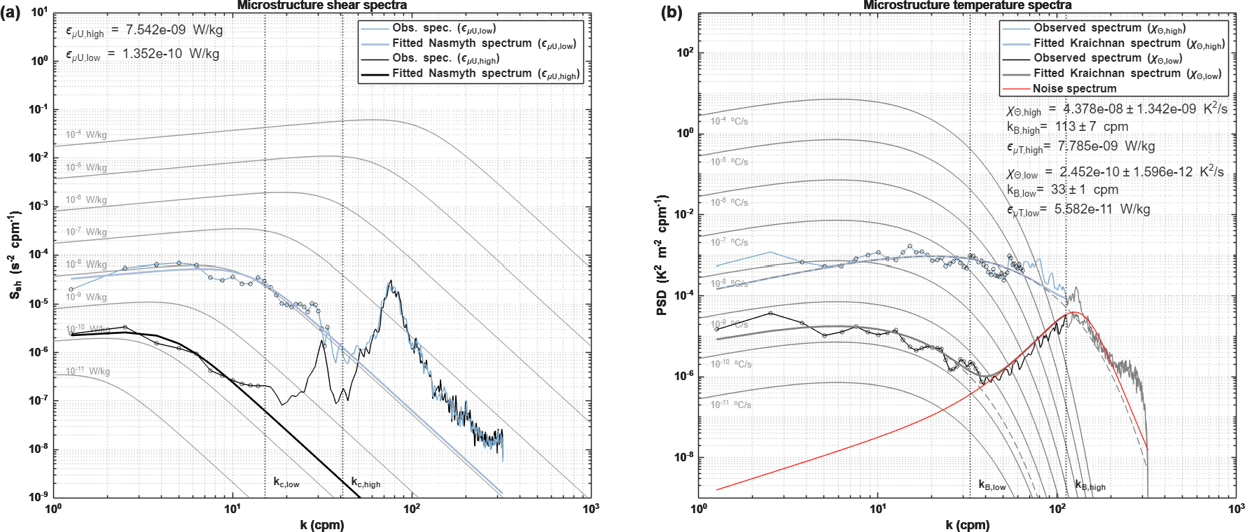 The thermal variance dissipation rate and the Batchelor wave number were obtained by fitting the observed microscale temperature-gradient spectrum to a theoretical model spectrum (Kraichnan, 1968; Ruddick et al., 2000) (see Appendix A for a more extensive description).