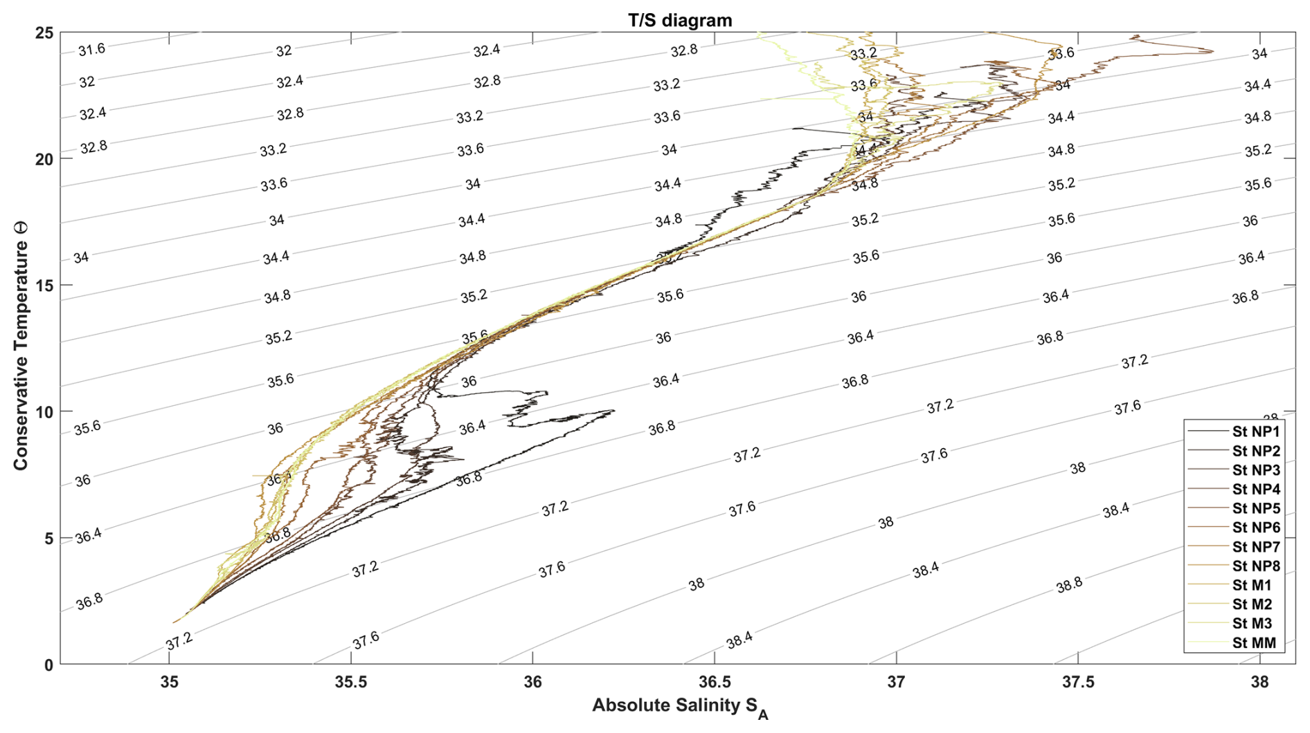 All (in-situ) temperature and conductivity data from the CTD systems were converted to Conservative Temperature (Θ) and Absolute Salinity (SA) using the GSW software toolbox (IOC et al., 2010; McDougall and Barker, 2011) and Neutral Density γn (Jackett and McDougall, 1997). Conservative Temperature Θ (°C) is proportional to potential enthalpy (by the constant heat capacity factor (J kg−1 K−1), representing the heat content per unit mass of seawater (McDougall, 2003; Graham and McDougall, 2013). Absolute Salinity SA is designed to approximate the ratio between the mass of dissolved material and the mass of seawater (g kg−1) (Wright et al., 2011; McDougall et al., 2012). It is measured on the reference-composition salinity scale (Millero et al., 2008).